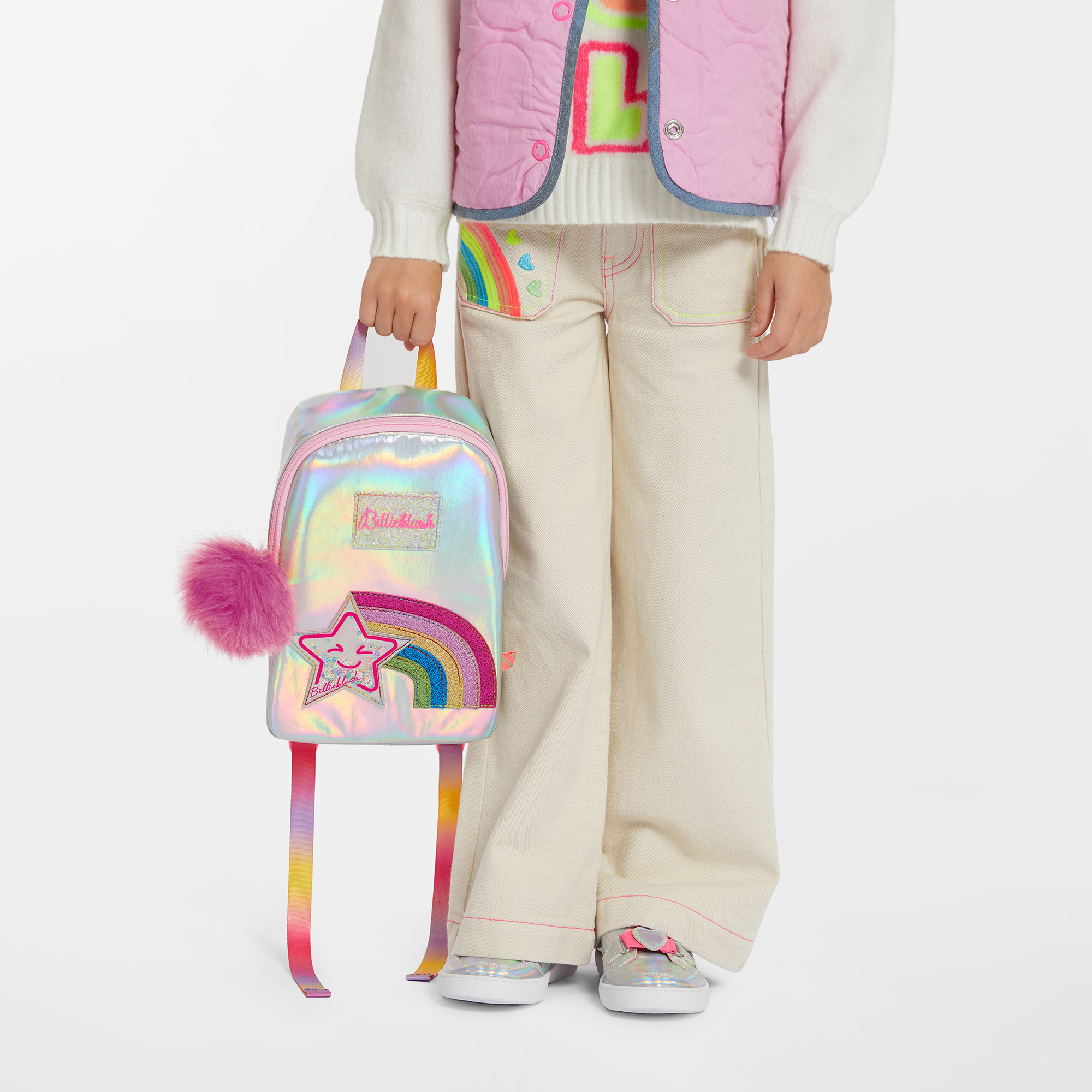 Billieblush backpack σε άσπρο ιριδίζον χρώμα διακοσμημένη με ενα υπέροχο ουράνιο τόξο απο glitter και ένα αστέρι χαμεγαλαστό. Κουμπώνει με φερμουάρ και έχει ριθμιζόμενους ιμάντες.