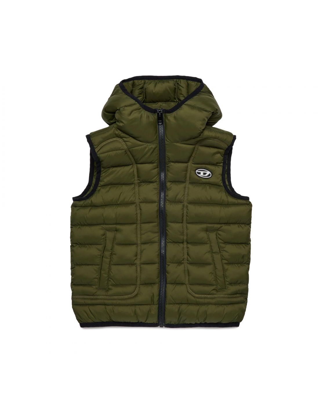Παιδικό γιλέκο Diesel με κουκούλα και κλείσιμο φερμουάρ σε όλο το μήκος. Κατασκευασμένο από μαλακό νάιλον, προσφέρει puffy σιλουέτα και άνεση στη χρήση. Διαθέτει patch τσέπες για πρακτικότητα, ενώ οι καπιτονέ ραφές δημιουργούν δυναμικό οπτικό αποτέλεσμα. Το λογότυπο Oval D στο στήθος προσθέτει χαρακτηριστική λεπτομέρεια στο σχέδιο.