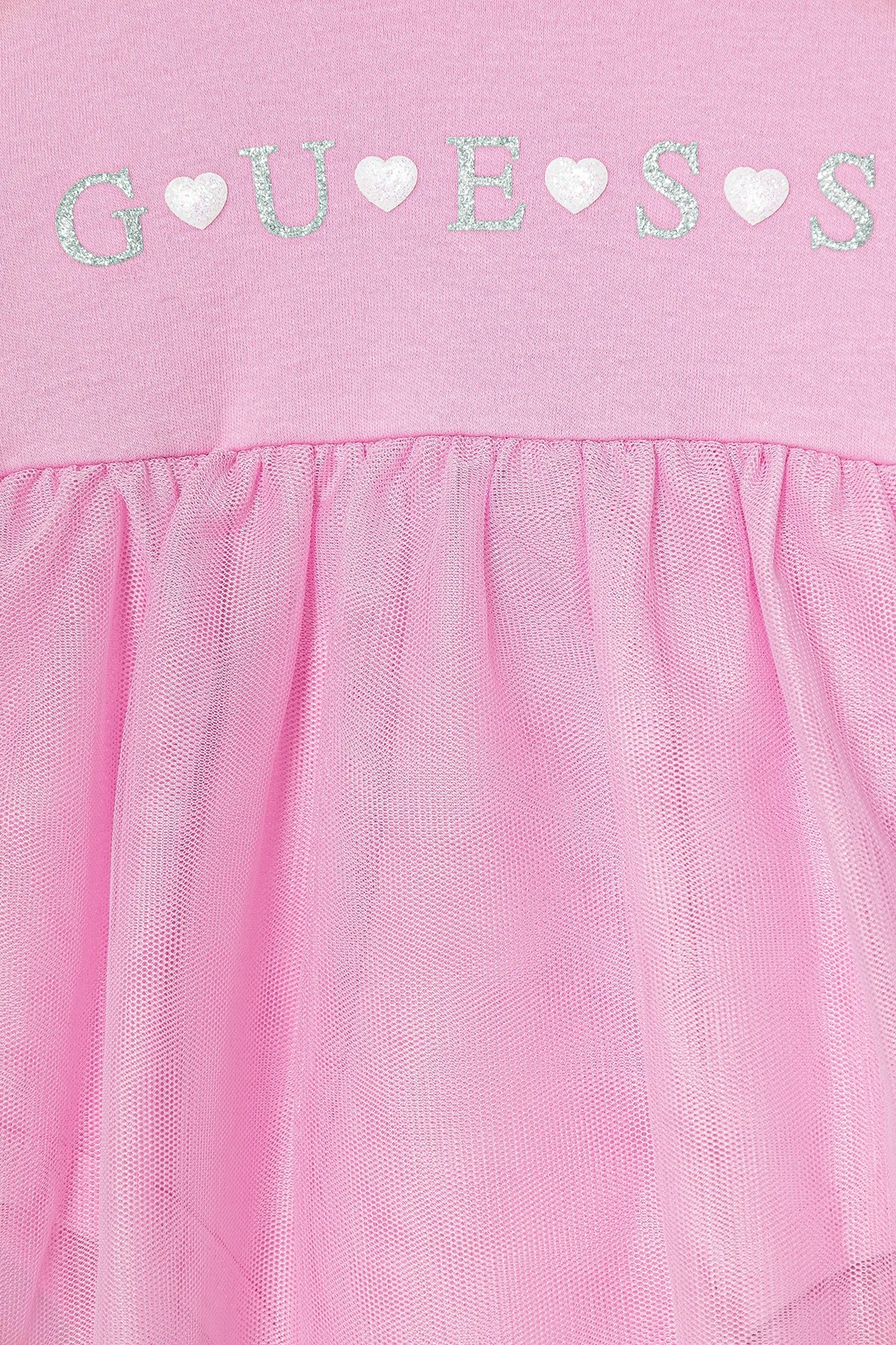Βρεφικό φόρεμα κορμάκι Guess για κορίτσια με λογότυπο. Το βρεφικό φόρεμα κορμάκι συνδυάζεται με κορμάκι και τούλι, με κοντά μανίκια, στρογγυλή λαιμόκοψη, άνοιγμα στη μέση και επιγραφή με το λογότυπο στο πάνω μέρος. Το βρεφικό φόρεμα έχει κούμπωμα tic-tac στην πλάτη. Το βρεφικό φόρεμα κορμάκι είναι κατασκευασμένο από άνετο και υψηλής ποιότητας ύφασμα.