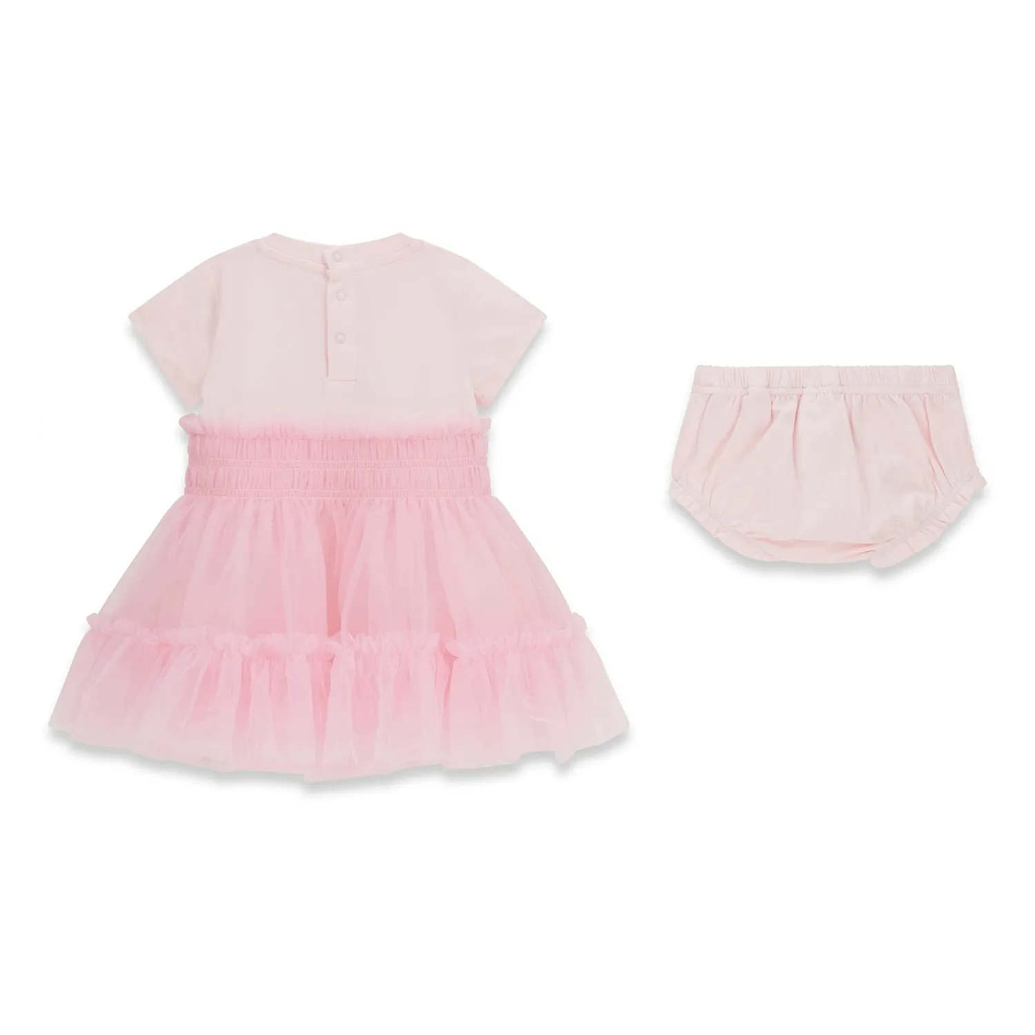 Αυτό το κομψό φόρεμα με κοντό μανίκι από την Guess έχει απαλό ροζ μπούστο με λογότυπο με ασημί στρας και απαλή ροζ φούστα από τούλι σε στρώσεις.
