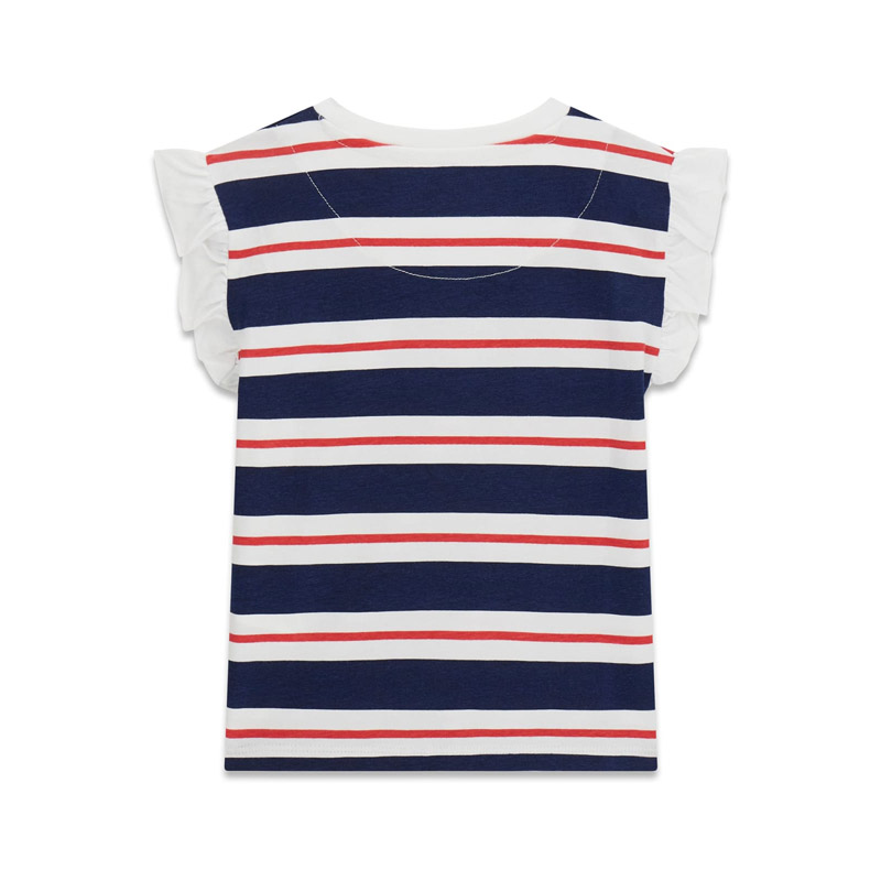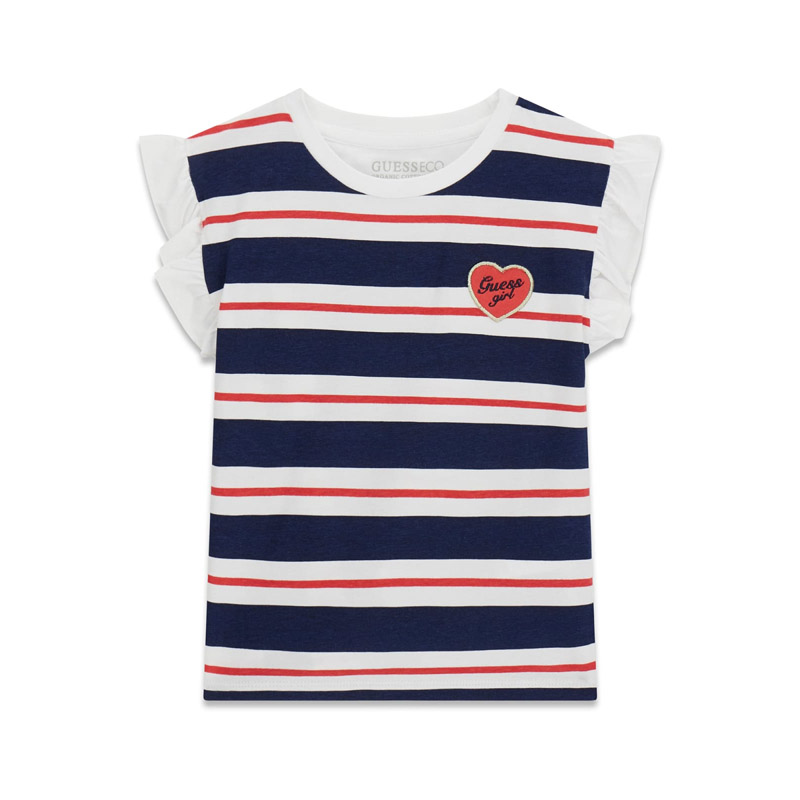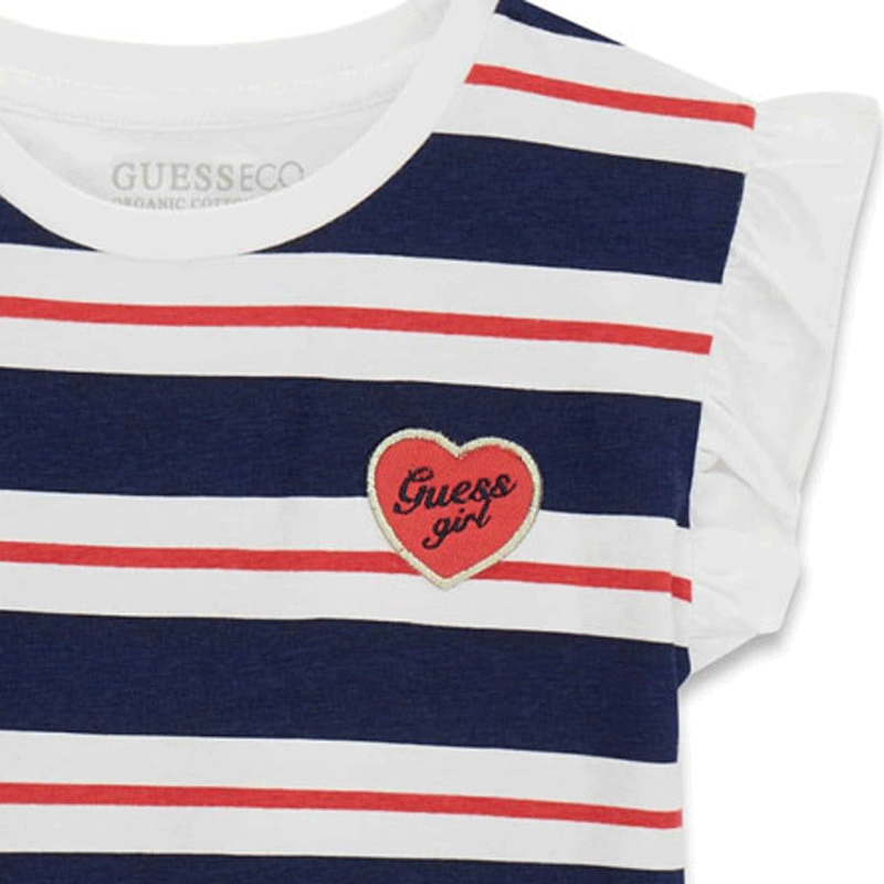 Αποκτήστε ένα ενδιαφέρον παιδικό μπλουζάκι Guess για κορίτσια με λογότυπο καρδιάς. Το παιδικό μπλουζάκι είναι ριγέ, με βολάν στους ώμους, στρογγυλή λαιμόκοψη και κεντημένη καρδιά με λογότυπο. Το παιδικό μπλουζάκι είναι κατασκευασμένο από άνετο ύφασμα.