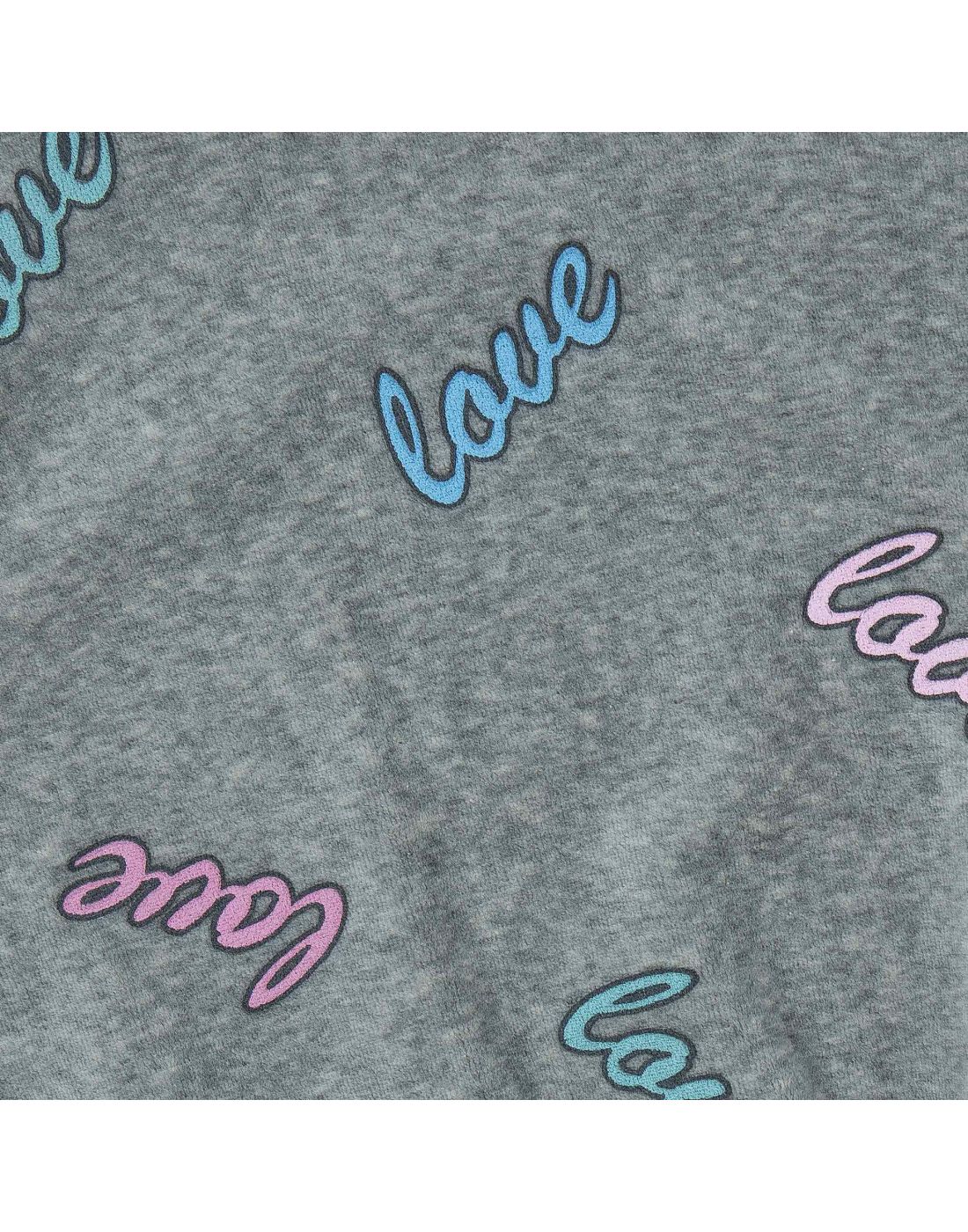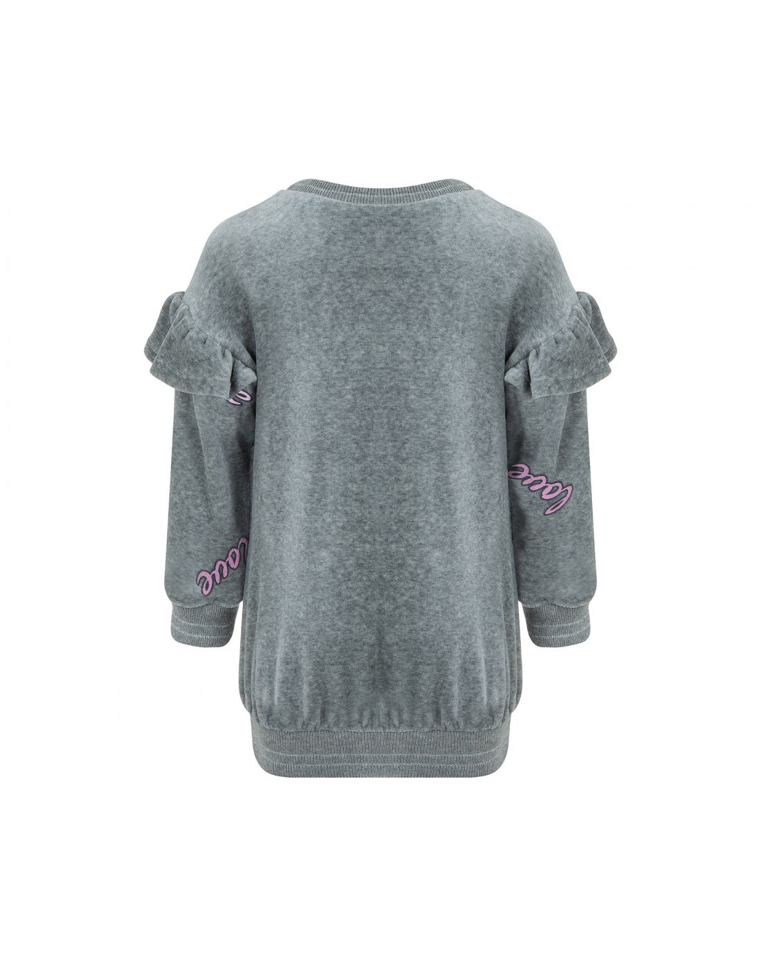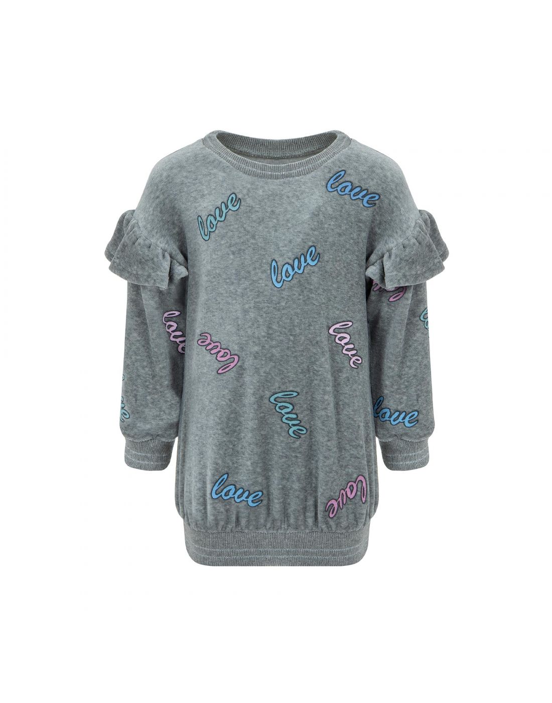 Ανανεώστε το ντύσιμο της μικρής σας με αυτό το γκρι φόρεμα φούτερ , διακοσμημένο με πολύχρωμα σχέδια “love”. Με ρομαντικές φραμπαλά λεπτομέρειες στους ώμους και απαλή υφή, είναι ιδανικό για καθημερινές εμφανίσεις με στυλ και άνεση.