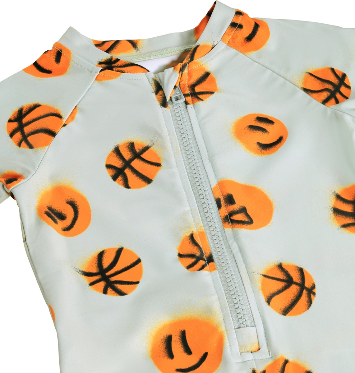 Μπεζ μαγιό με πορτοκαλί τύπωμα μπάσκετ για τα μικρά παιδιά, κατασκευασμένο από ανακυκλωμένο πολυεστέρα με προστασία UV 50+. Έχει μακριά μανίκια, κοντά μπατζάκια, φερμουάρ μπροστά, όρθιο γιακά και χώρο για μια πάνα.