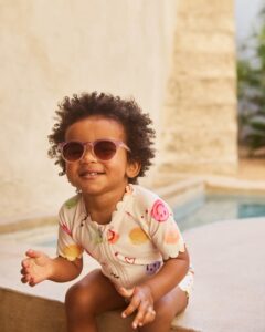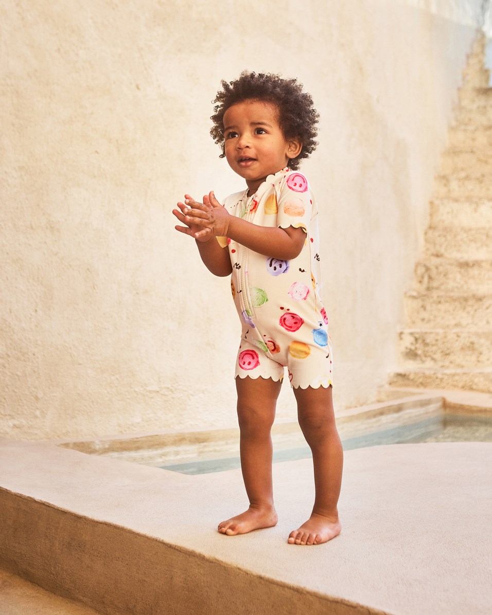 Μαγιό σε κρεμ χρώμα με τύπωμα πάγου για τα μικρά παιδιά, κατασκευασμένο από ανακυκλωμένο πολυεστέρα με προστασία UV 50+. Διαθέτει κοντά μανίκια και μπατζάκια, φερμουάρ μπροστά, απαλές κυματιστές άκρες και χώρο για μια πάντα.