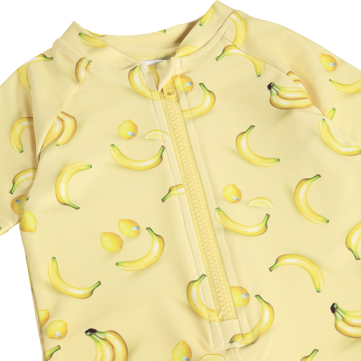 Κίτρινο μαγιό με στάμπα φρούτων για τα μικρά παιδιά, κατασκευασμένο από ανακυκλωμένο πολυεστέρα με προστασία UV 50+. Έχει κοντά μανίκια και μπατζάκια, φερμουάρ μπροστά, όρθιο γιακά και χώρο για μια πάνα.
