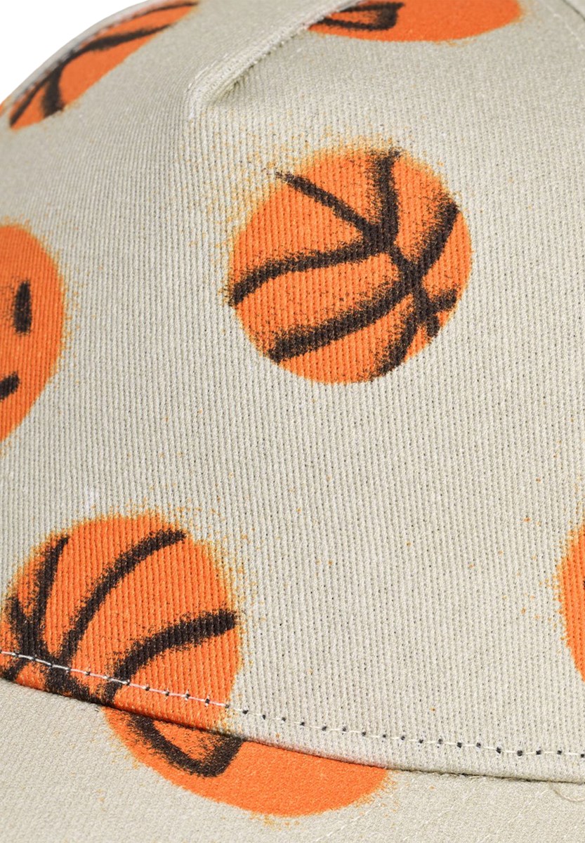 Μπεζ καπέλο με πορτοκαλί τύπωμα μπάσκετ. Το καπέλο έχει φαρδύ γείσο, διχτυωτό ύφασμα στο πίσω μέρος για καλό αερισμό και ρυθμιζόμενο κλείσιμο στο λαιμό που παρέχει τέλεια εφαρμογή. Ιδανικό για εκδρομές στην παραλία και υπαίθριες περιπέτειες.