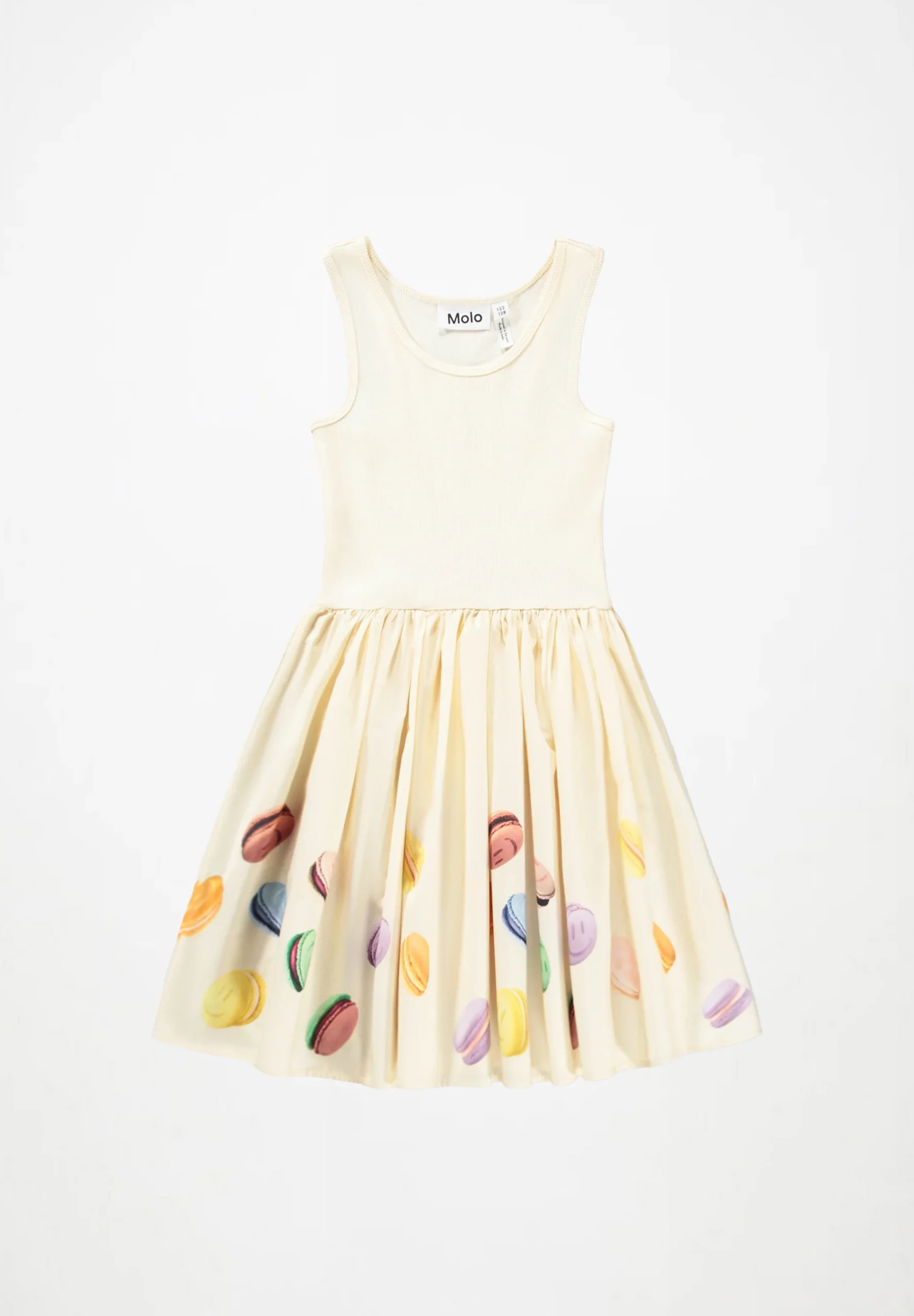 Φόρεμα με τιράντες σε υπόλευκο χρώμα, από απαλό, οργανικό βαμβάκι. Το πάνω μέρος έχει στενή εφαρμογή από ζέρσεϊ με ριμπ ύφανση, και η φούστα από βαμβακερή ποπλίνα έχει ένα γοητευτικό τύπωμα από χαμογελαστά μακαρόν. Είναι ένα άνετο και εορταστικό φόρεμα με καλή ελευθερία κινήσεων.