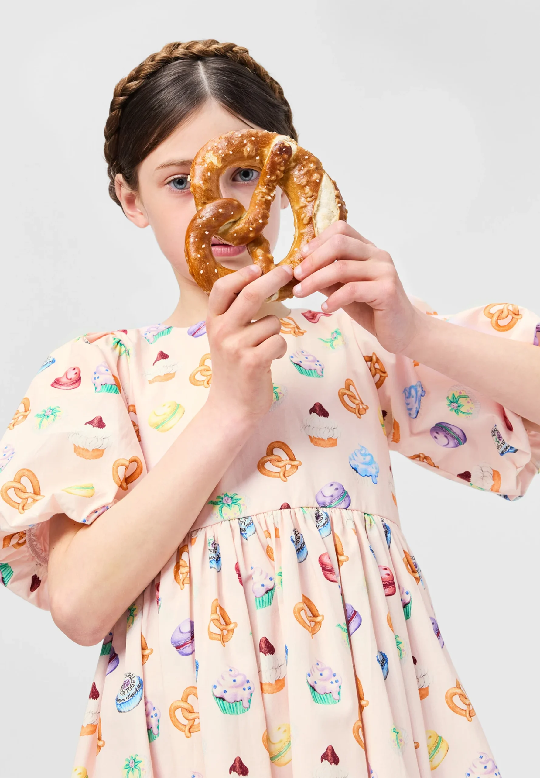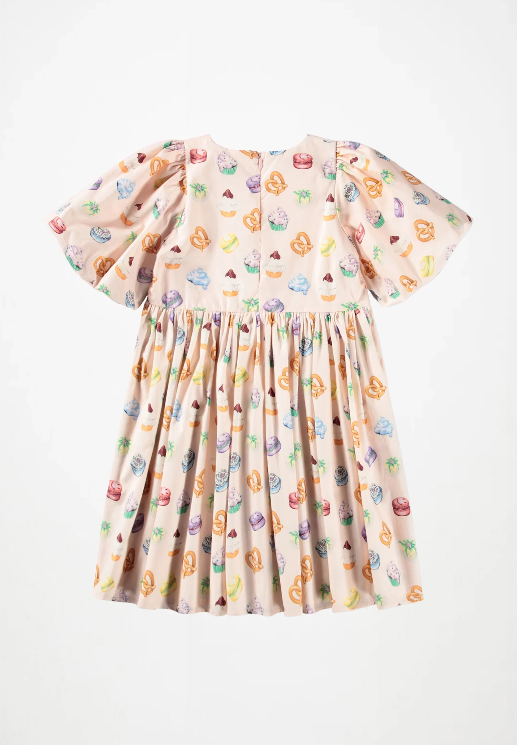 Ροζ φόρεμα μέχρι το γόνατο, φτιαγμένο από απαλή, οργανική βαμβακερή ποπλίνα με στρογγυλή λαιμόκοψη και κοντά φουσκωτά μανίκια με λάστιχο. Το φόρεμα έχει κανονική εφαρμογή και κλείνει με ένα αόρατο φερμουάρ στο πίσω μέρος, διευκολύνοντας την τοποθέτηση και την αφαίρεση. Το πολύχρωμο σχέδιο δείχνει νόστιμα, ανάμεικτα κέικ και δίνει στο φόρεμα μια παιχνιδιάρικη και ιδιόμορφη εμφάνιση.