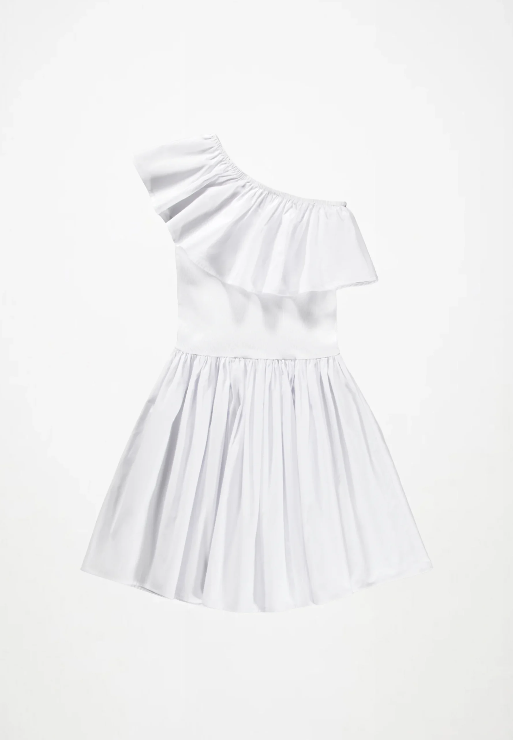Πράσινο φόρεμα με έναν ώμο από απαλό οργανικό βαμβάκι με εφαρμοστό ριμπ τοπ και κυκλική φούστα από ανοιχτόχρωμη βαμβακερή ποπλίνα μέχρι το γόνατο που προσθέτει όγκο και κίνηση. Κατά μήκος του ντεκολτέ υπάρχει ένα φαρδύ βολάν από ποπλίνα, που δίνει στο φόρεμα μια παιχνιδιάρικη και θηλυκή έκφραση.