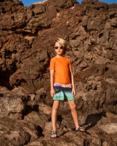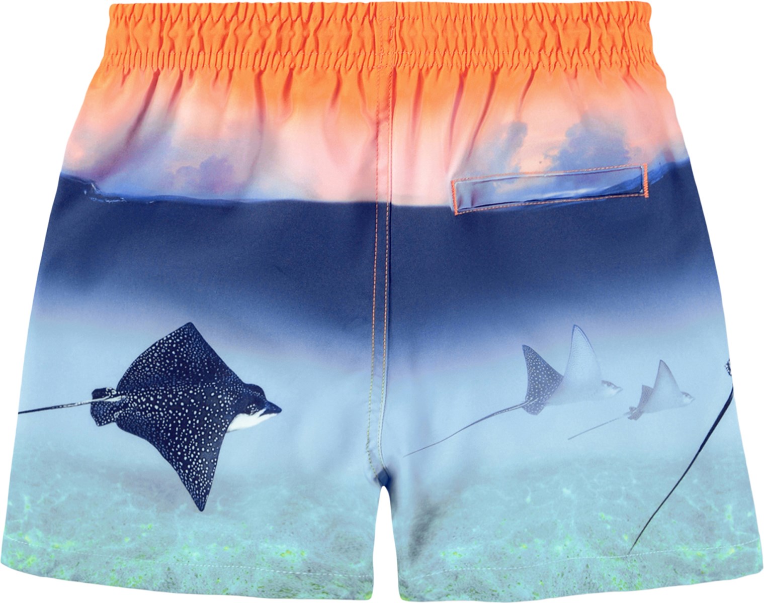 Αθλητικό μαγιό σε μπλε και πορτοκαλί χρώμα με τύπωμα στον ωκεανό για δραστήρια παιδιά, κατασκευασμένο από ανακυκλωμένο πολυεστέρα με προστασία UV50+. Το σορτς έχει άνετη εφαρμογή, μήκος μέχρι τη μέση των μηρών, λάστιχο και κορδόνι στη μέση, μαλακό εσωτερικό mesh σορτς και πρακτική τσέπη στο πίσω μέρος.