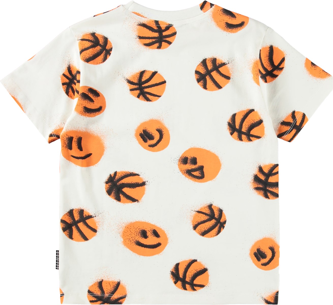 Μπεζ μπλουζάκι από απαλό οργανικό βαμβάκι με κοντά μανίκια και ριμπ λαιμόκοψη. Το μπλουζάκι έχει άνετη εφαρμογή με τύπωμα μικρών μπάσκετ.