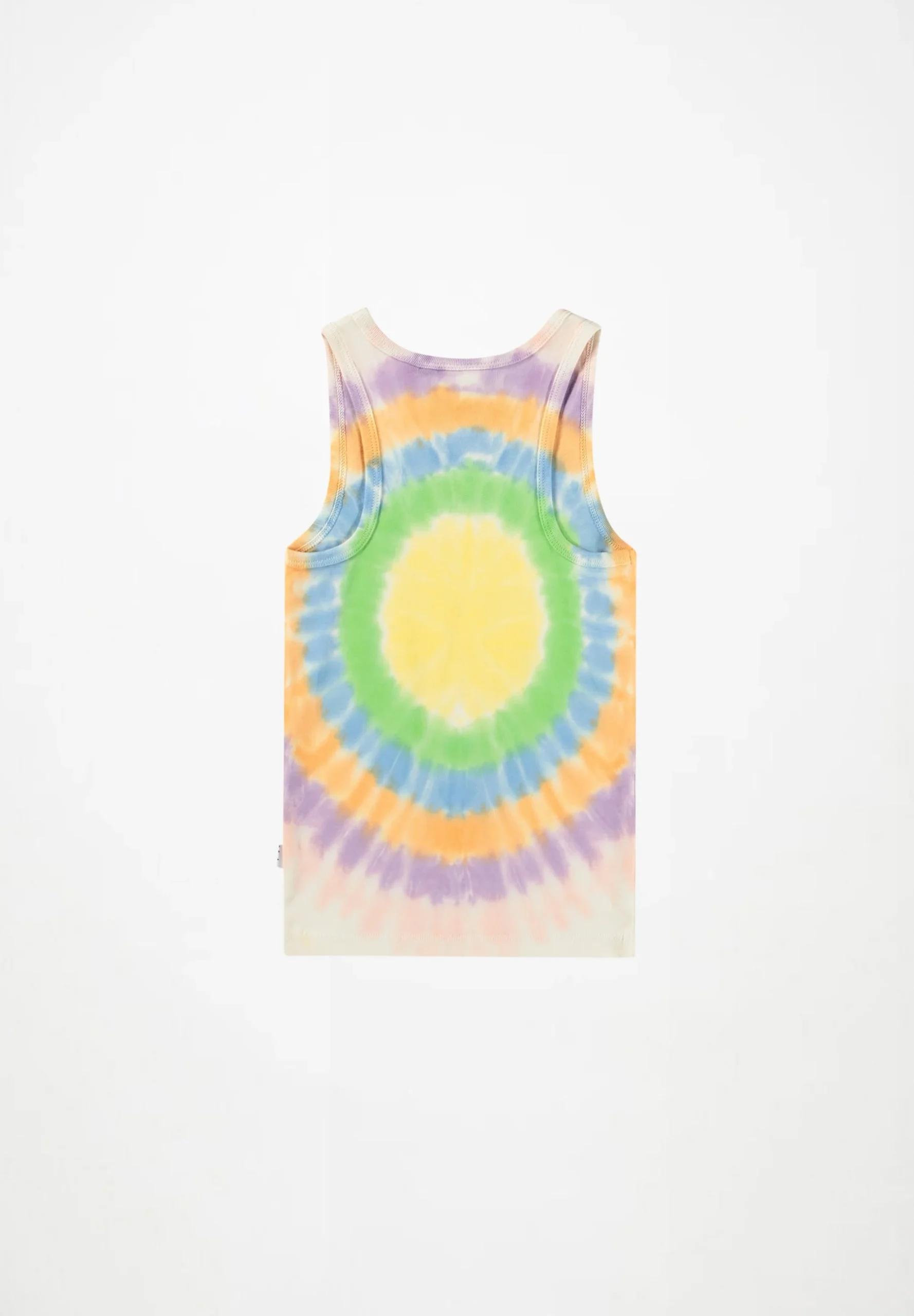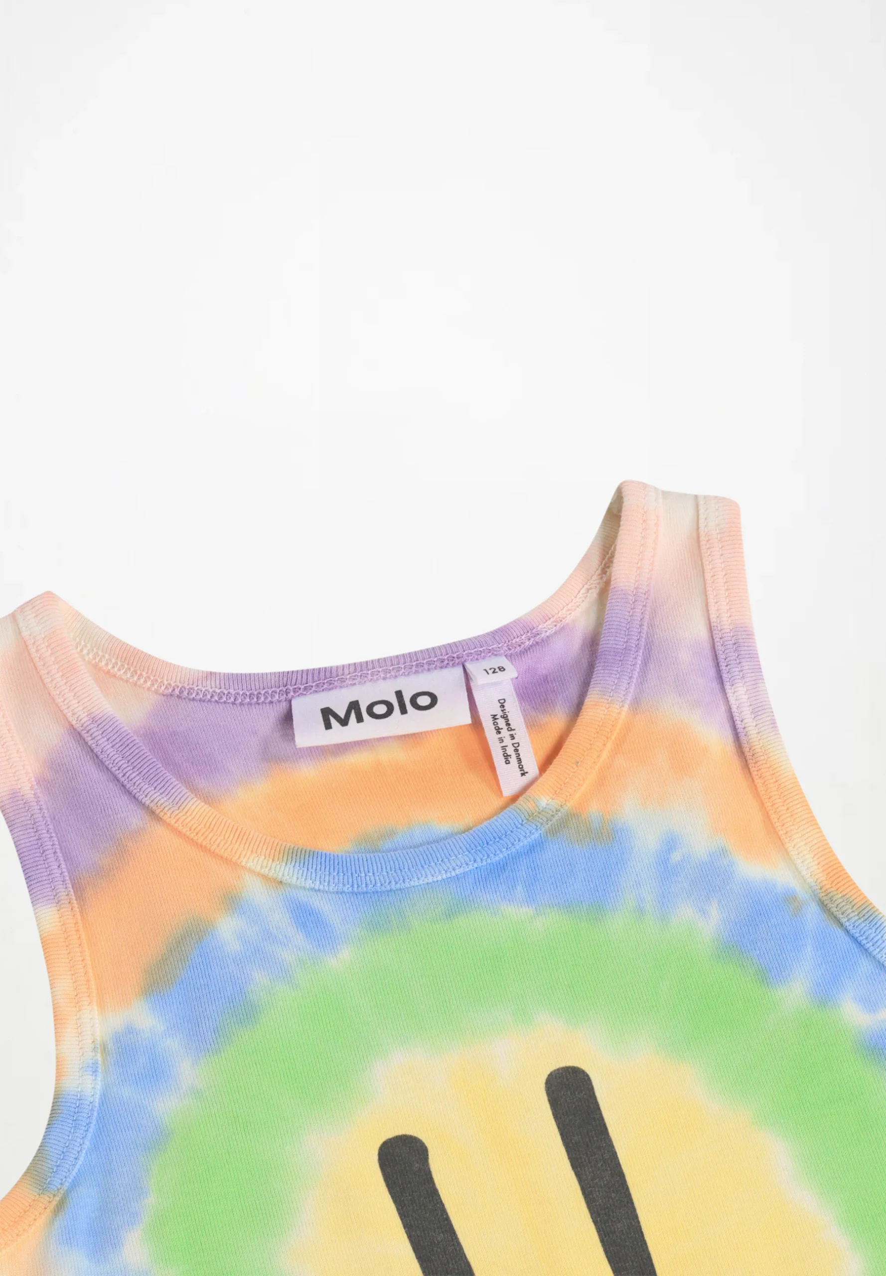 Εφαρμοστό φανελάκι από απαλό οργανικό βαμβάκι με στρογγυλή λαιμόκοψη και δέσιμο. Το τοπ είναι σε πολύχρωμο tie-dye με τύπωμα ενός χαμογελαστού προσώπου. Όλα τα tie-dye μας είναι χειροποίητα, δημιουργώντας ένα μοναδικό μοτίβο που ποικίλλει από στυλ σε στυλ.