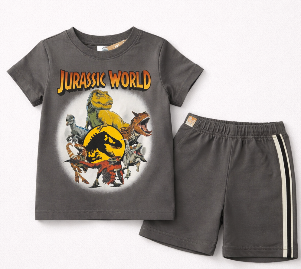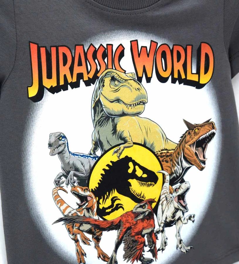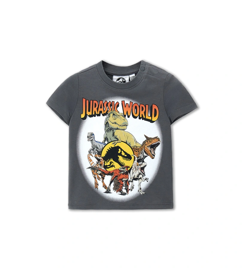 Μπλούζα Jurassic World για αγόρια σε γκρι βαμβακερό ζέρσεϊ με κοντά μανίκια και ριμπ λαιμόκοψη. Με στάμπα μπροστά, είναι το τέλειο κομμάτι για να προσθέσετε μια διασκεδαστική, περιπετειώδη πινελιά στις καθημερινές σας εμφανίσεις.