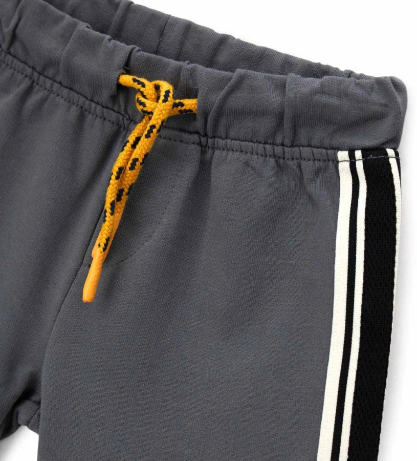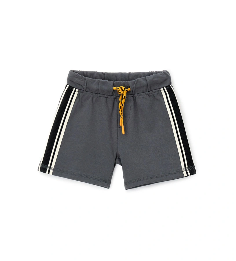Βερμούδα για αγόρια από βαμβακερό φλις, άνετη και πρακτική χάρη στην ελαστική ζώνη με ρυθμιζόμενο κορδόνι. Η πλαϊνή λωρίδα προσθέτει μια πινελιά σπορ και μοντέρνου στυλ. Ιδανική για μια casual και ευέλικτη εμφάνιση, ιδανική για κάθε ώρα της ημέρας
