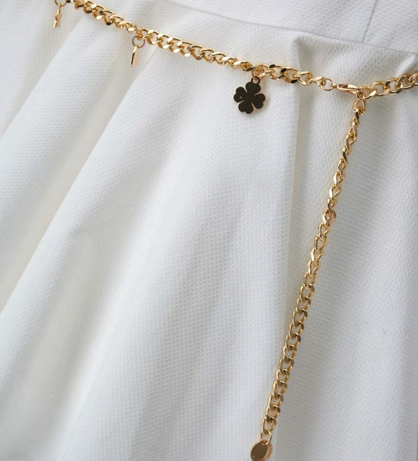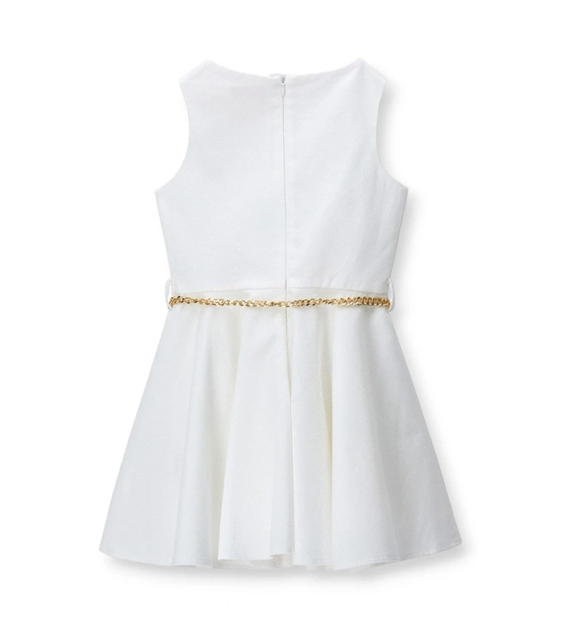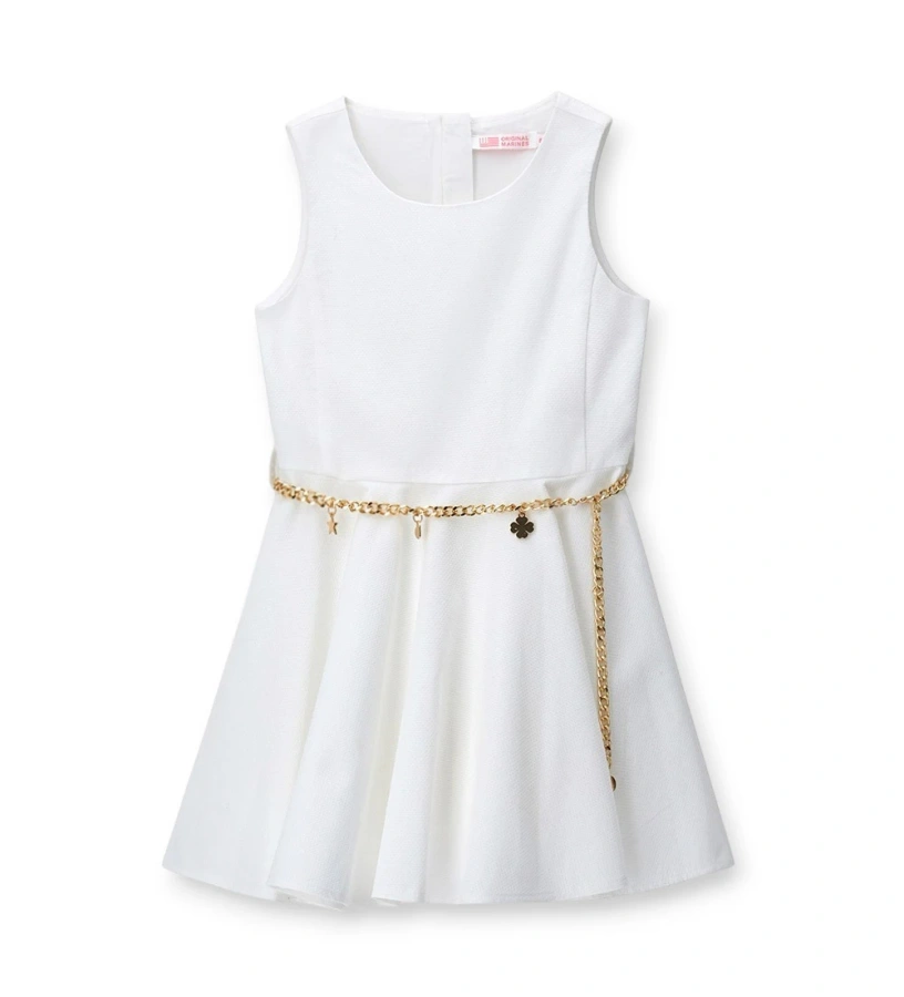 Φόρεμα πικέ από βαμβακερό κοριτσίστικο ύφασμα με εσωτερική επένδυση, στρογγυλή λαιμόκοψη και μανσέτες. Το κλείσιμο με φερμουάρ στην πλάτη εξασφαλίζει πρακτικότητα, ενώ η αφαιρούμενη επιχρυσωμένη ζώνη με τα κρεμαστά μενταγιόν προσθέτει μια κομψή και εκλεπτυσμένη πινελιά.