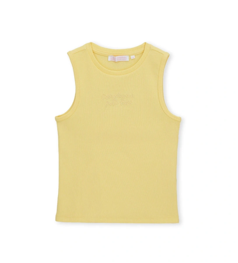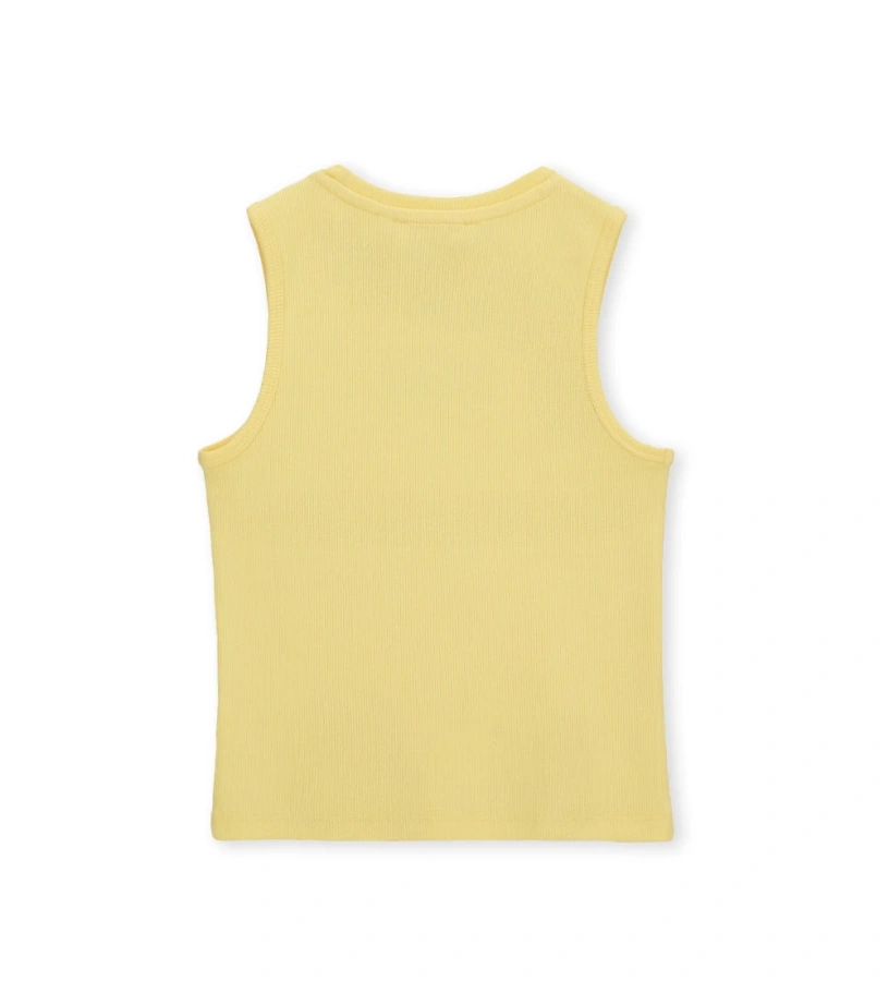 Κοριτσίστικο μπλουζάκι από ελαστικό βαμβάκι με ριμπ ύφανση, στρογγυλή λαιμόκοψη και τρύπες στα μασχάλες. Το κέντημα στο μπροστινό μέρος προσθέτει μια λεπτή και εκλεπτυσμένη λεπτομέρεια, καθιστώντας το το τέλειο κομμάτι για καλοκαιρινές εμφανίσεις.