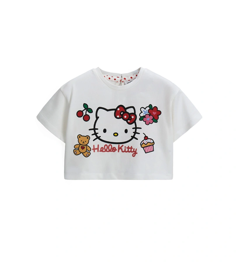 Λευκό κοριτσίστικο μπλουζάκι Hello Kitty από ελαστικό ζέρσεϊ με στρογγυλή λαιμόκοψη, κοντά μανίκια, άνοιγμα με κουμπιά στο πίσω μέρος και τύπωμα με glitter που προσθέτει μια φωτεινή και παιχνιδιάρικη πινελιά στο μπλουζάκι.