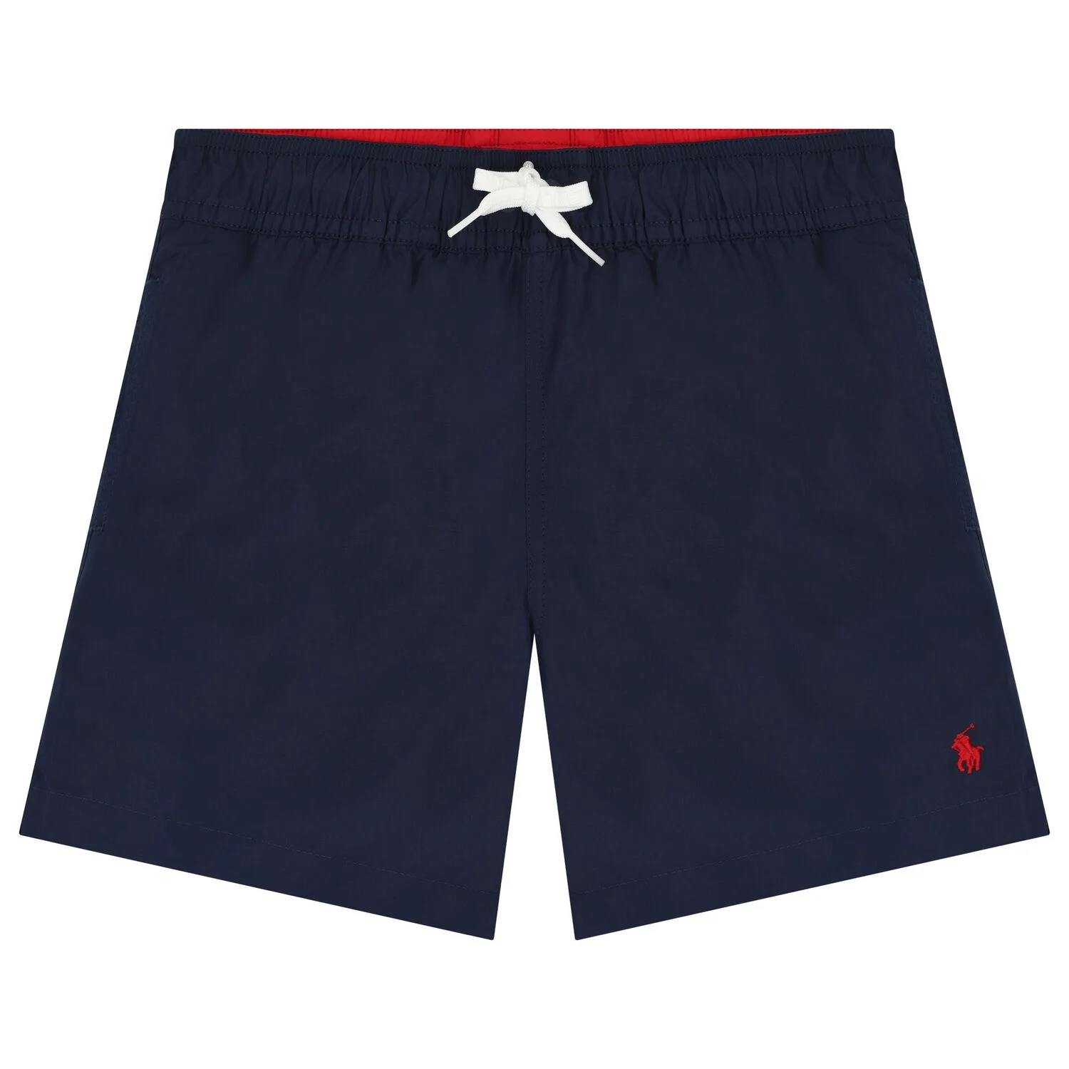 Μπλε μαγιό για αγόρια από την εμβληματική μάρκα Ralph Lauren. Κατασκευασμένο από απαλό και μεταξένιο ύφασμα με το λογότυπο της μάρκας κεντημένο με κόκκινο χρώμα στο ένα πόδι. Είναι ελαφρύ, με επένδυση από διχτυωτό ύφασμα και ελαστική μέση με κορδόνι. Συνοδεύεται από εσωτερικό σλιπ από διχτυωτό ύφασμα.