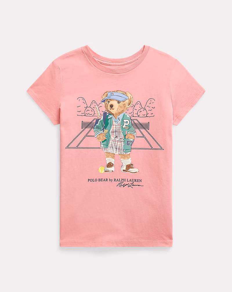 Ροζ μπλουζάκι για κορίτσια από την εμβληματική μάρκα Ralph Lauren. Κατασκευασμένο από απαλό βαμβακερό ζέρσεϊ, φέρει το εμβληματικό τύπωμα Polo Bear της μάρκας στο μπροστινό μέρος.