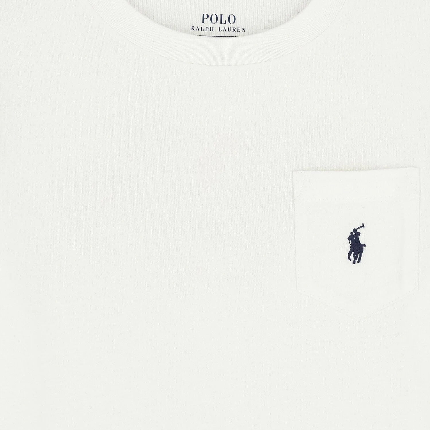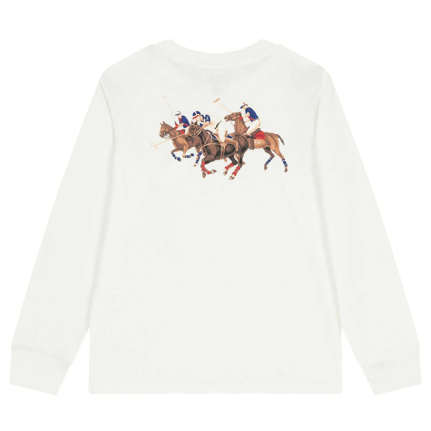 Λευκό μπλουζάκι με μακριά μανίκια για αγόρια από την εμβληματική μάρκα Ralph Lauren. Κατασκευασμένο από απαλό βαμβακερό ζέρσεϊ, διαθέτει τσέπη στο στήθος με το εμβληματικό πόνι της μάρκας κεντημένο σε μπλε σκούρο χρώμα. Έχει γραφική εκτύπωση με πόνι στο πίσω μέρος.