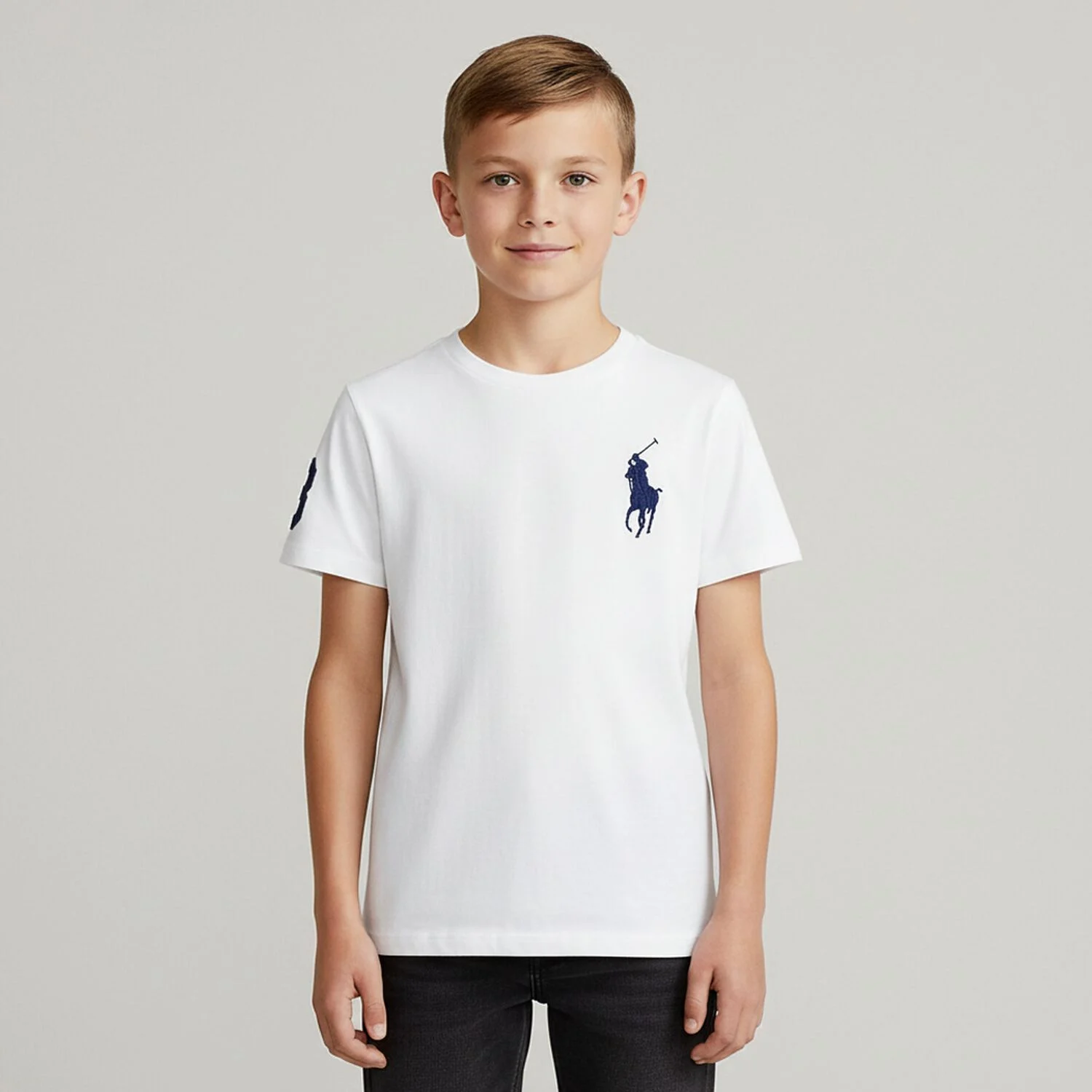Λευκό μπλουζάκι για αγόρια από την εμβληματική μάρκα Ralph Lauren. Κατασκευασμένο από απαλό βαμβακερό ζέρσεϊ, απεικονίζει το εμβληματικό πόνι της μάρκας κεντημένο στο στήθος και τον αριθμό στο ένα μανίκι.