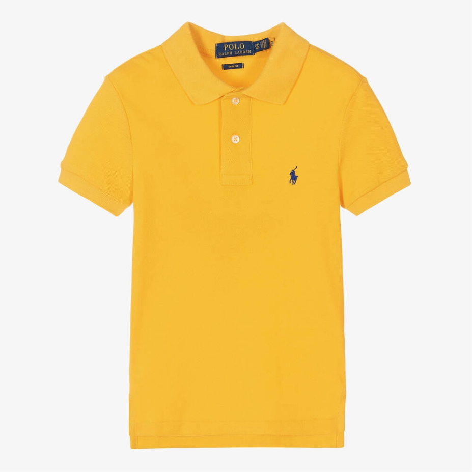 Κίτρινο πόλο μπλουζάκι από τον Ralph Lauren, με το χαρακτηριστικό λογότυπο του σχεδιαστή με το πόνυ κεντημένο μπροστά σε μπλε χρώμα. Σχεδιασμένο για στενή εφαρμογή, αυτό το casual τοπ είναι φτιαγμένο από απαλό βαμβακερό πικέ, με σχισμένα πλαϊνά ανοίγματα και ελαφρώς μακρύτερο στρίφωμα στο πίσω μέρος. Έχει ελαφρώς ριμπ γιακά, κοντά μανίκια και πατιλέτα με δύο κουμπιά.