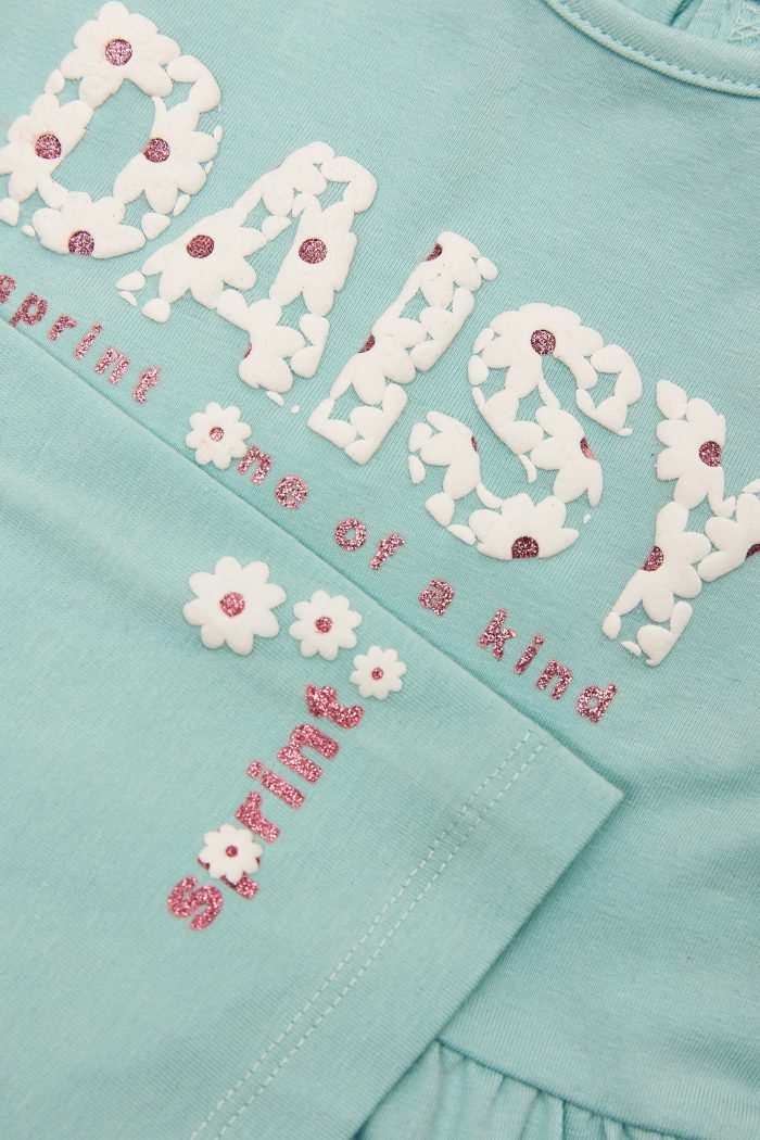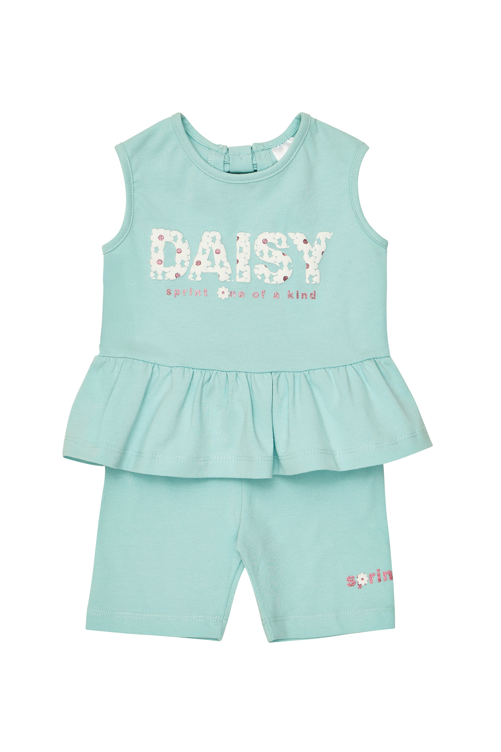 Παιδικό σετ 2 τεμαχίων λύκρα. Μπλούζα αμάνικη με ανάγλυφο τύπωμα “DAISY” με floral λεπτομέρειες στο στήθος και κομψό βολάν στο κάτω μέρος για μια girly εμφάνιση. Πλάτη με άνοιγμα και διακοσμητικούς φιόγκους. Κολάν ποδηλατικό με ελαστικό ζωνάρι και τύπωμα.