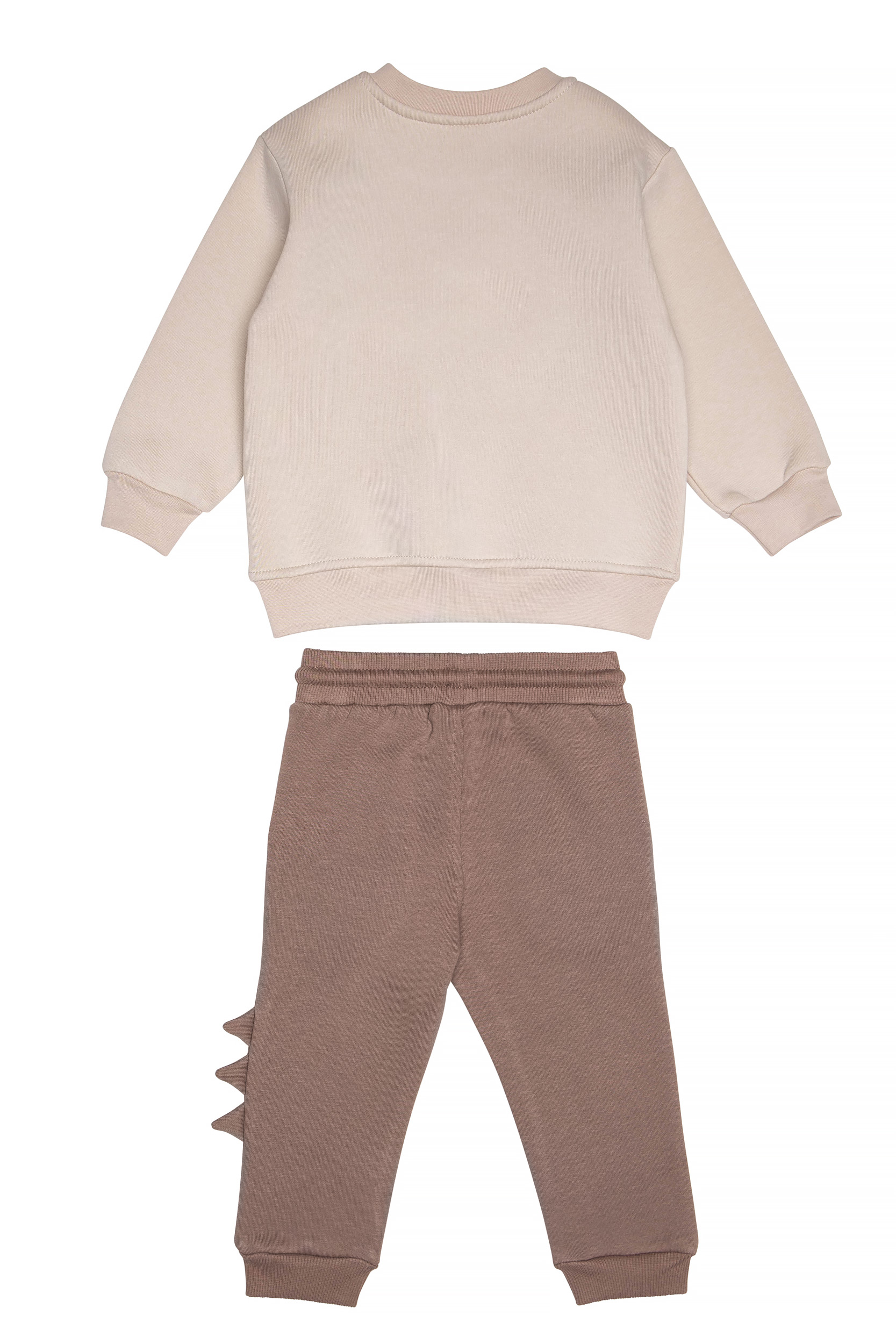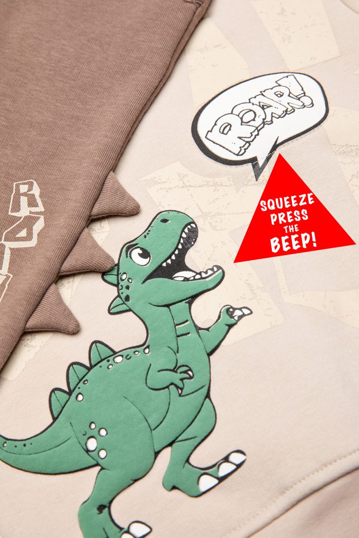 Παιδικό σετ φόρμας 2 τεμαχίων φούτερ με χνούδι. Μπλούζα με στρογγυλή λαιμόκοψη, τύπωμα εμπρός με ανάγλυφη υφή και θέμα DINOSAUR, εσωτερική κόρνα που κάνει ήχο. Παντελόνι με ελαστικό ζωνάρι και ρυθμιζόμενα κορδόνια, μπροστινές λοξές τσέπες με λεπτομέρεια πτερύγια στο πλαϊ και τύπωμα.