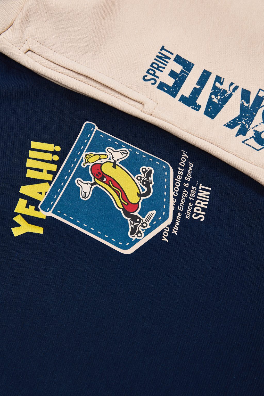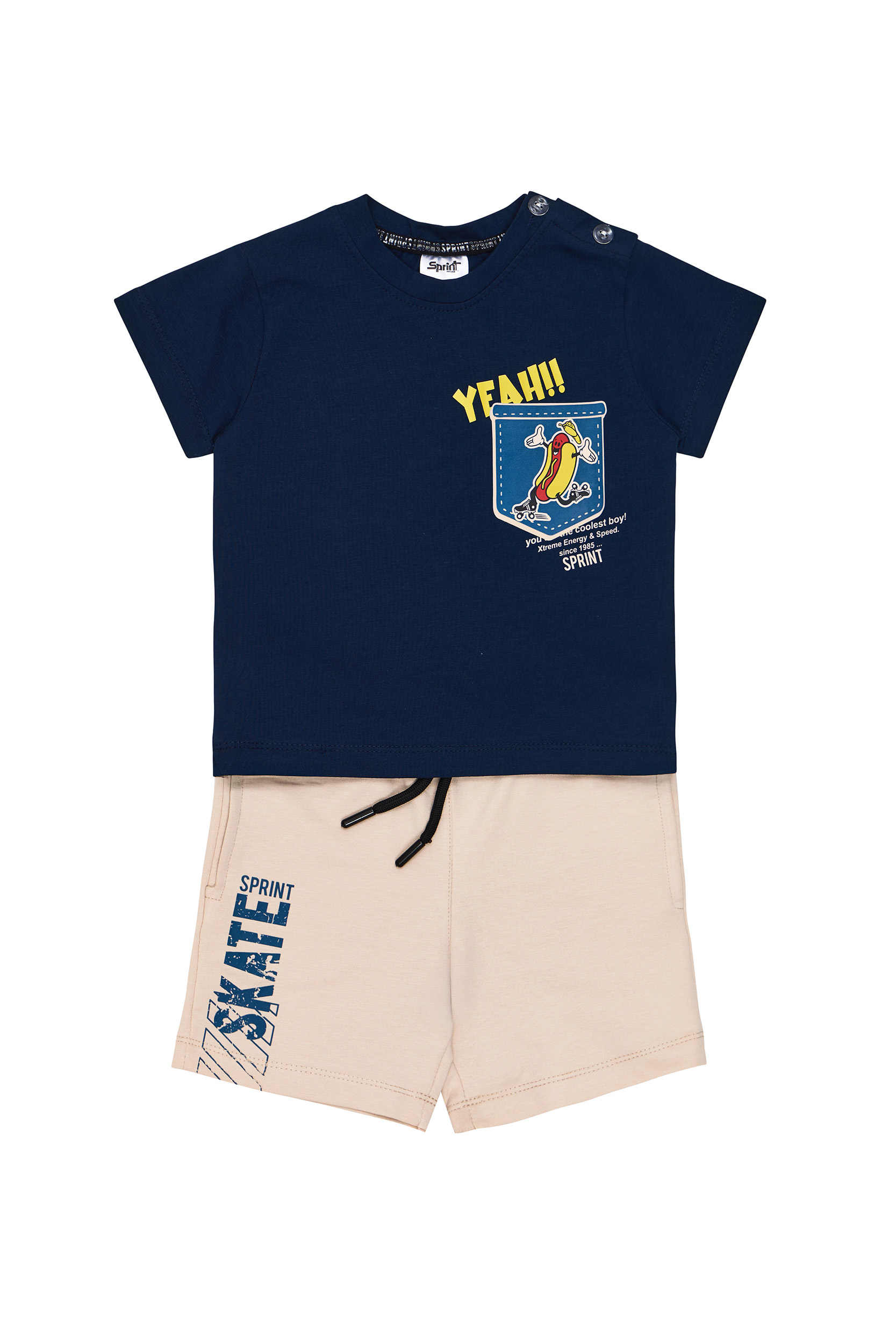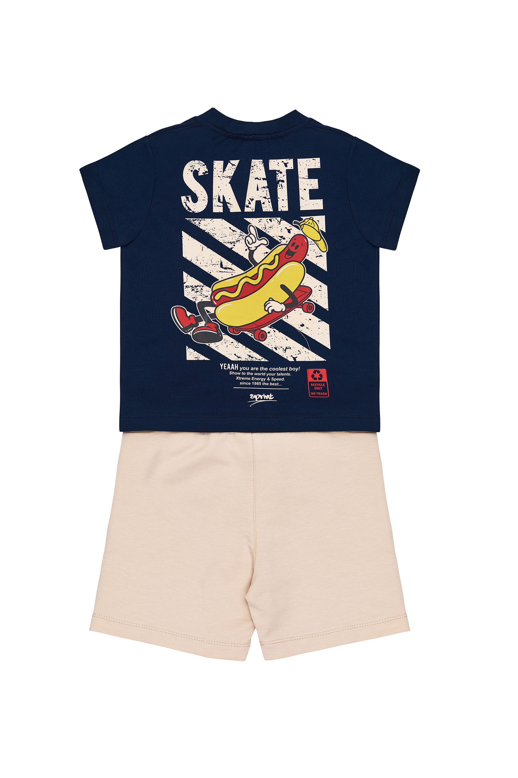 Παιδικό σετ 2 τεμαχίων. Μπλούζα με τύπωμα εμπρός έναν απίθανο χαρακτήρα Hot Dog, που κάνει φιγούρες πάνω σε roller skates μέσα σε μια “εικονική” τσέπη και τύπωμα στην πλάτη. Βερμούδα φούτερ με ελαστικό ζωνάρι και ρυθμιζόμενα κορδόνια, πλαϊνές τσέπες και λογότυπο “SKATE” στο πλάι.