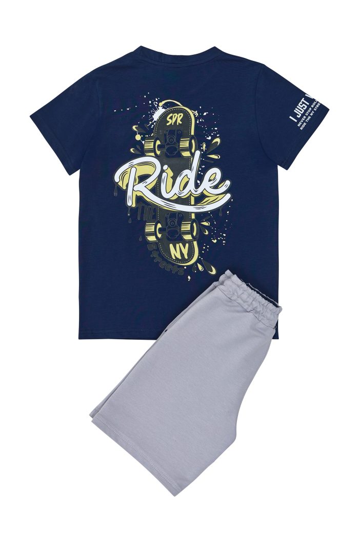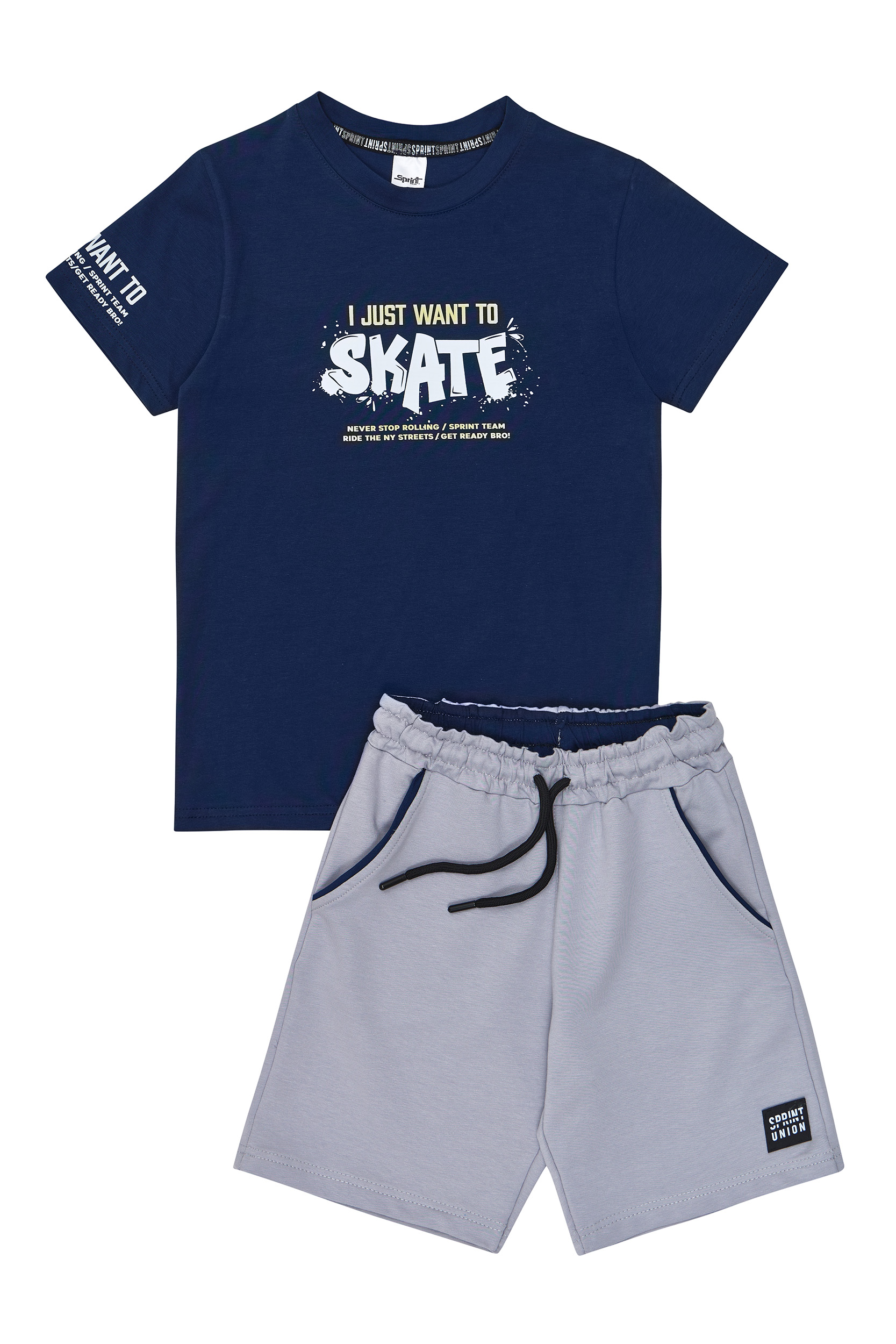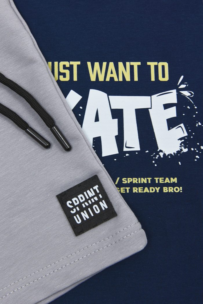 Παιδικό σετ 2 τεμαχίων. Μπλούζα με τύπωμα “Ride the Streets with Sprint” στο στήθος, στην πλάτη και στο μανίκι. Βερμούδα φούτερ με ελαστικό ζωνάρι, εσωτερικά με χρωματική αντίθεση και ρυθμιζόμενα κορδόνια, μπροστινές λοξές τσέπες και ετικέτα logo SPRINT στο κάτω μέρος.