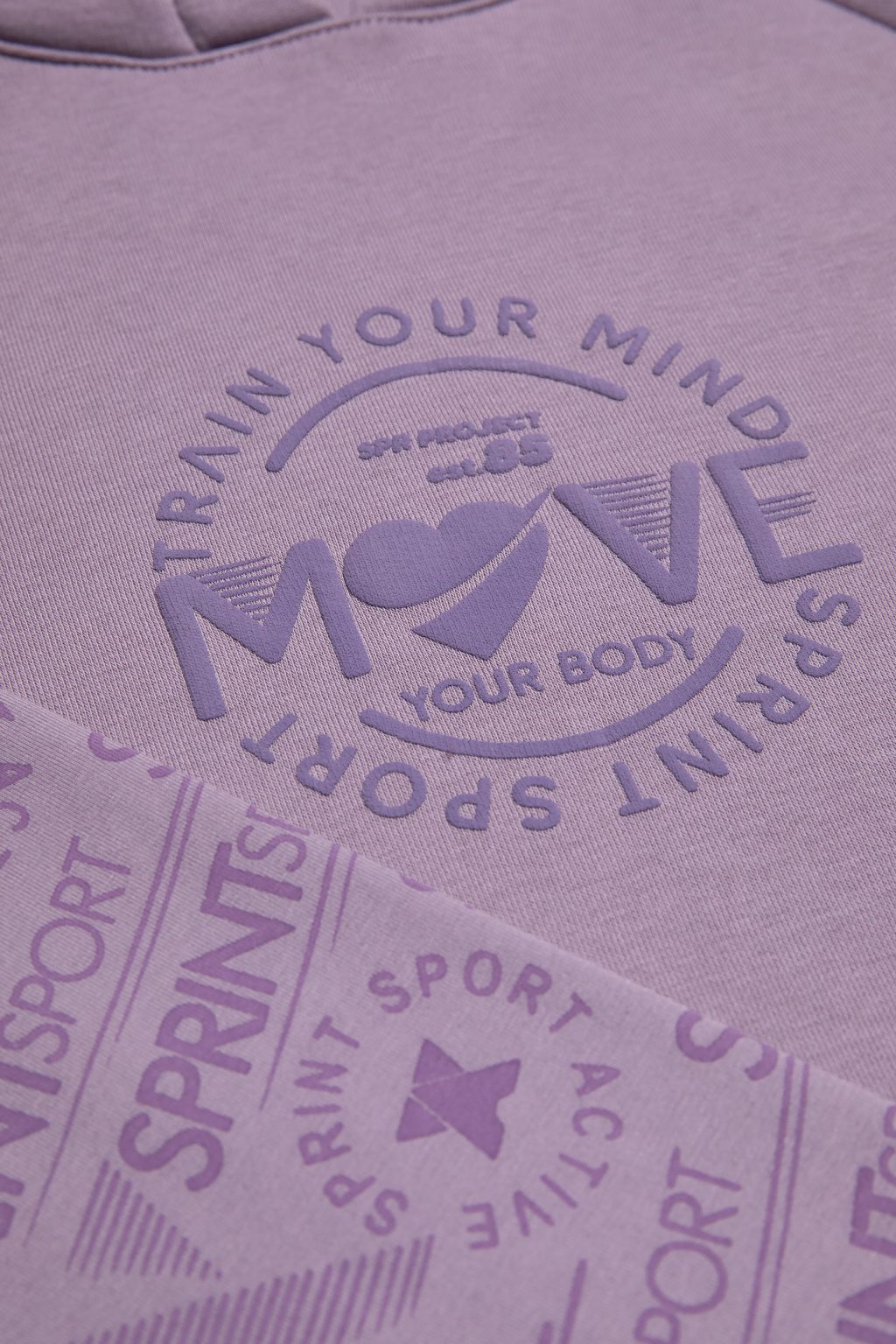Παιδικό σετ 2 τεμαχίων. Μπλούζα φούτερ με χνούδι με κουκούλα και τσέπη, τύπωμα εμπρός και στο πλάι με ανάγλυφη υφή και αθλητική τρέσα με λογότυπο SPRINT. Κολάν λύκρα με allover τύπωμα.