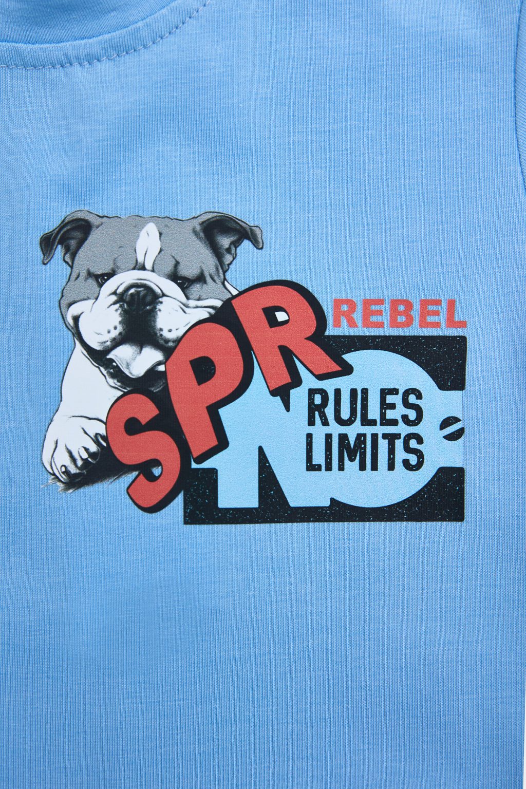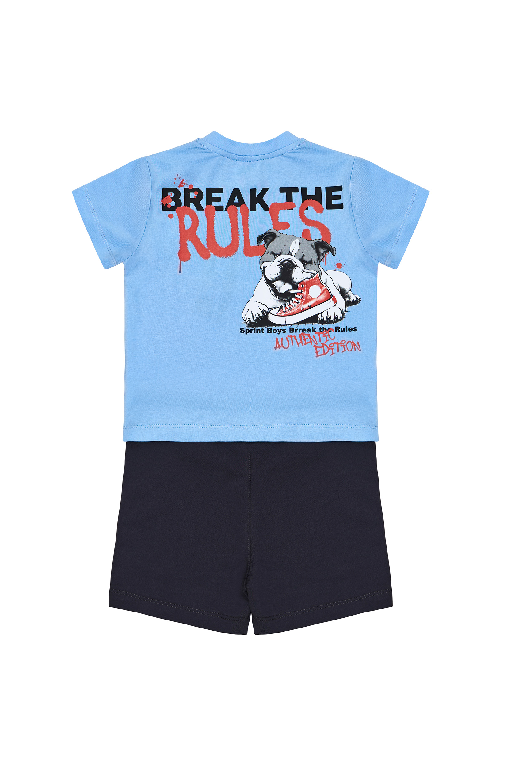 Παιδικό σετ 2 τεμαχίων. Μπλούζα με τύπωμα μπροστά και στην πλάτη με ένα bulldog που κρατά με παιχνιδιάρικη διάθεση ένα sneaker στο στόμα του. Βερμούδα φούτερ με ελαστικό ζωνάρι και ρυθμιζόμενα κορδόνια, μπροστινές λοξές τσέπες και τύπωμα.