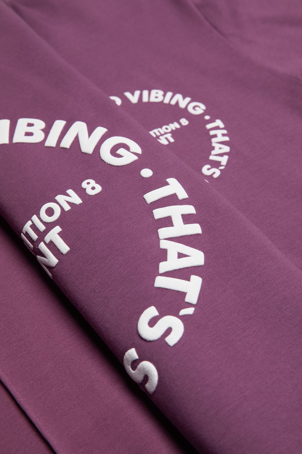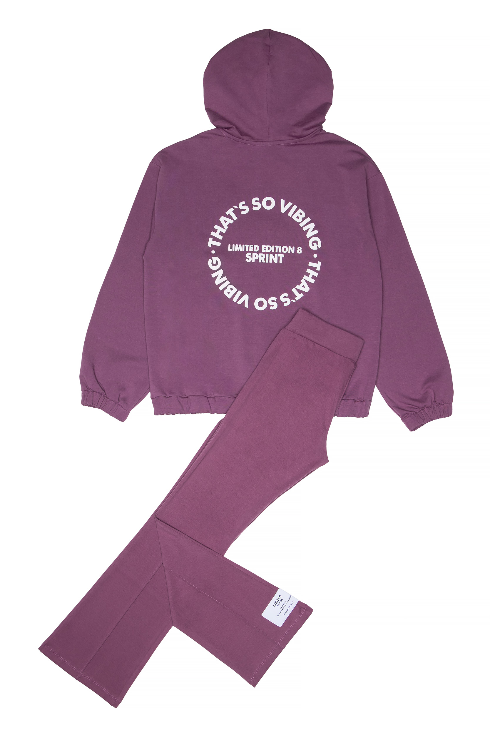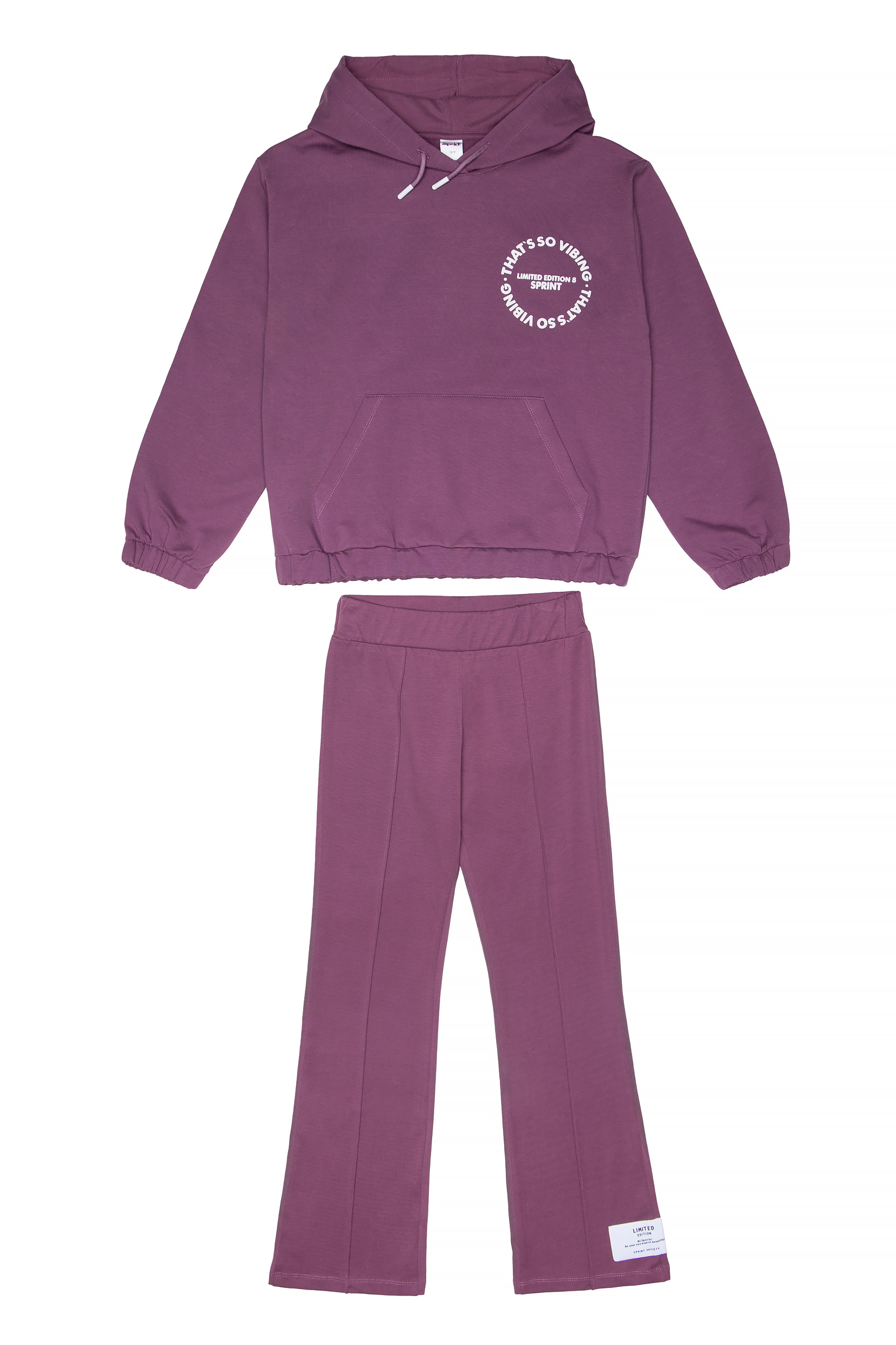 Παιδικό σετ 2 τεμαχίων λύκρα. Μπλούζα με κουκούλα και τσέπη με τύπωμα μπροστά και στην πλάτη με ανάγλυφη υφή. Κολάν τύπου καμπάνα με απλικέ ετικέτα.
