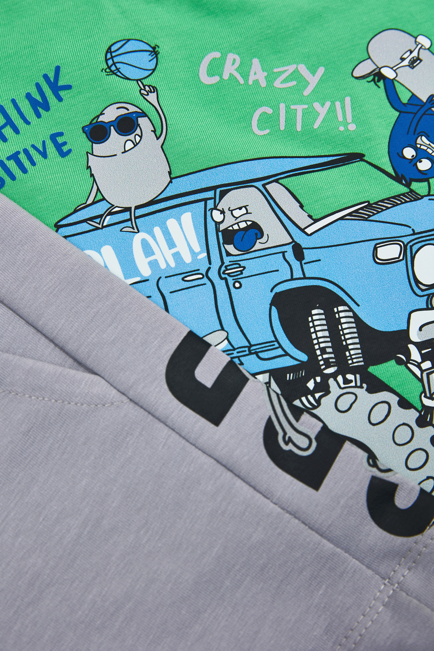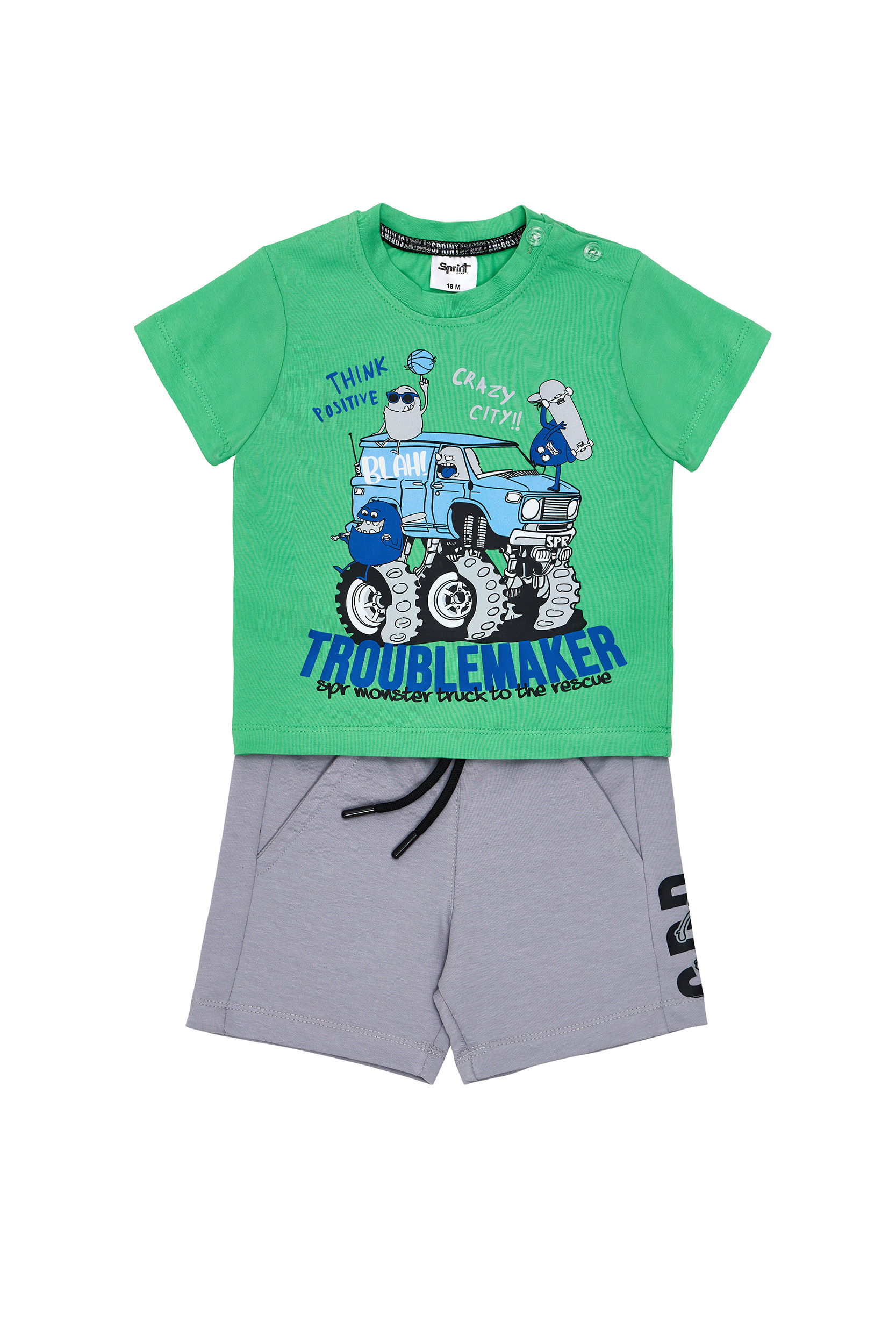 Παιδικό σετ 2 τεμαχίων. Μπλούζα με τύπωμα μπροστά και στην πλάτη με τους “Monster Troublemakers” έτοιμοι για περιπέτεια! Βερμούδα φούτερ με ελαστικό ζωνάρι και ρυθμιζόμενα κορδόνια. Μπροστινές λοξές τσέπες και τύπωμα.