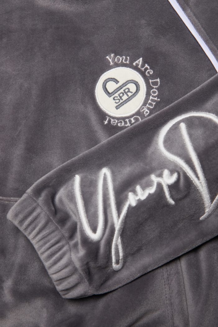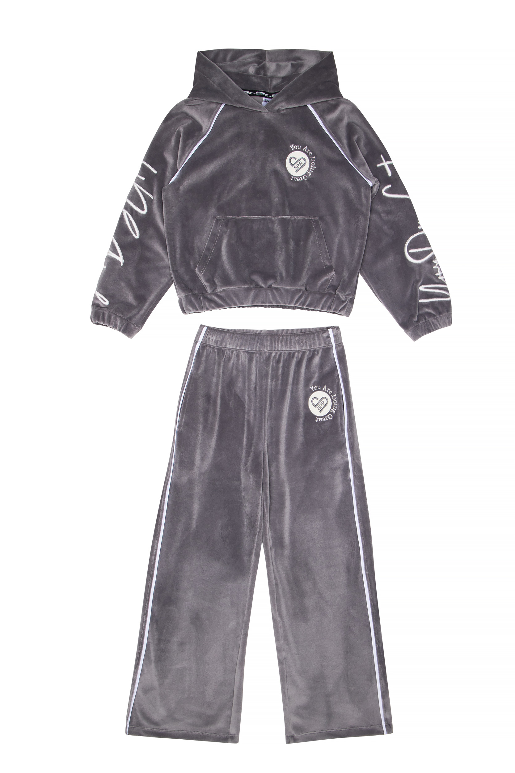Παιδικό σετ 2 τεμαχίων βελουτέ. Μπλούζα με κουκούλα και τσέπη με κέντημα στα μανίκια με ανάγλυφη υφή και λεπτομέρεια δίχρωμη στις ραφές. Ίσιο παντελόνι με ελαστικό ζωνάρι με πλαϊνές τσέπες και κέντημα.