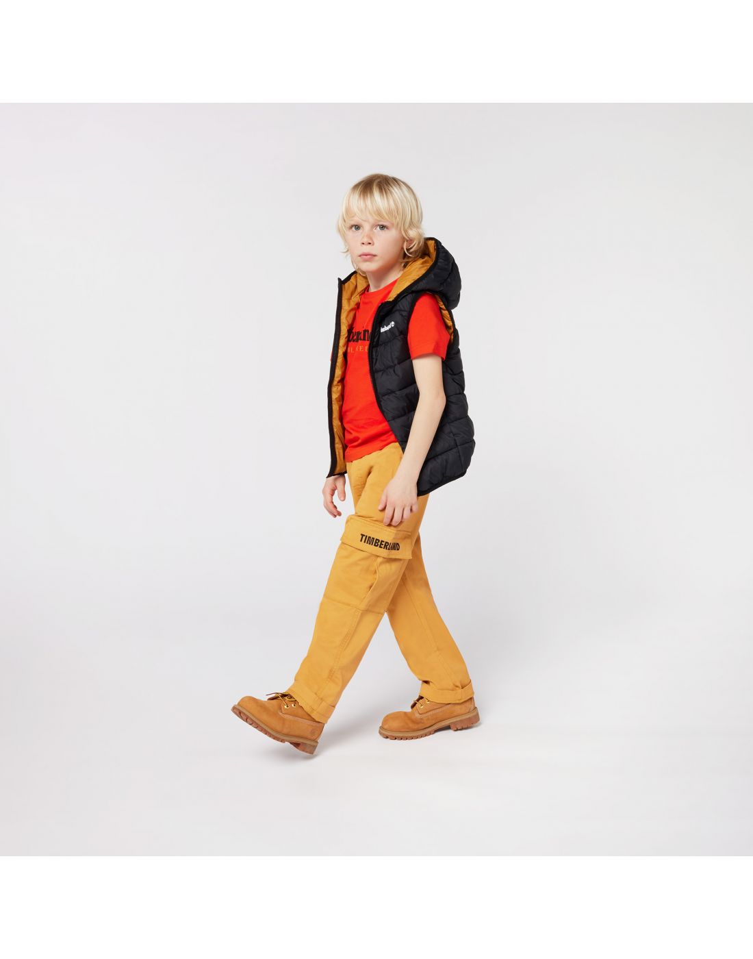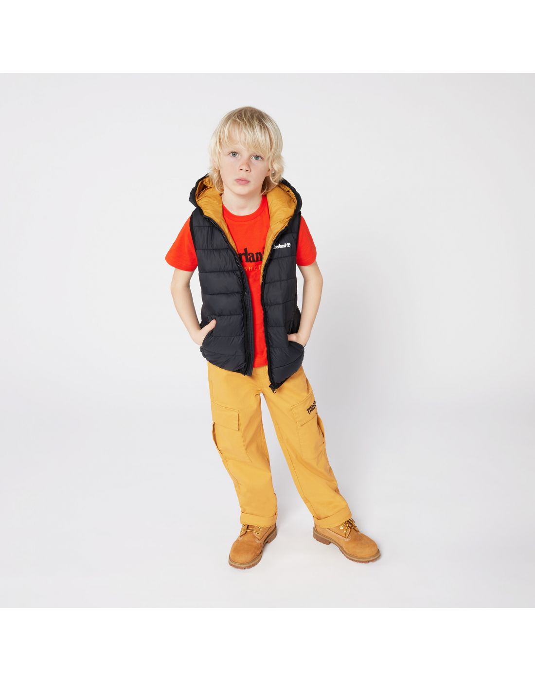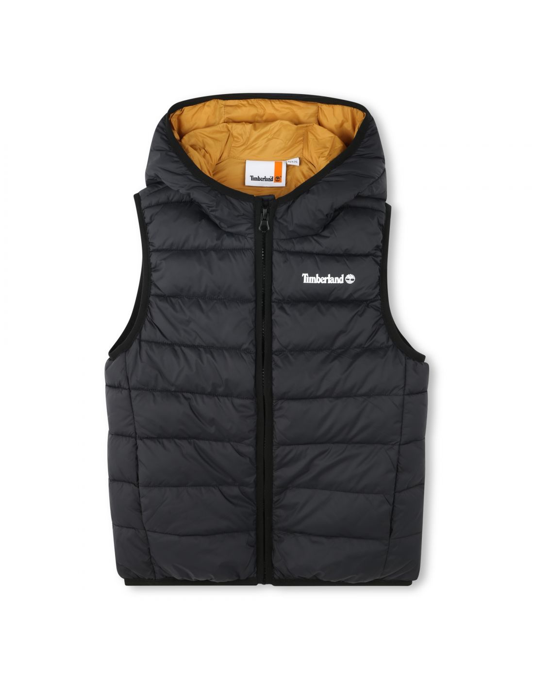 Κλασικό γιλέκο Timberland puffer σε μαύρο χρώμα με οριζόντιες ραφές. Εσωτερικά έχει καφέ επένδυση. Το καπιτονέ γιλέκο έχει κουκούλα και φερμουάρ μπροστά, καθώς και δύο τσέπες στα πλάγια. Το λογότυπο της Timberland είναι διακριτικά τοποθετημένο στο στήθος ως ωραία λεπτομέρεια.