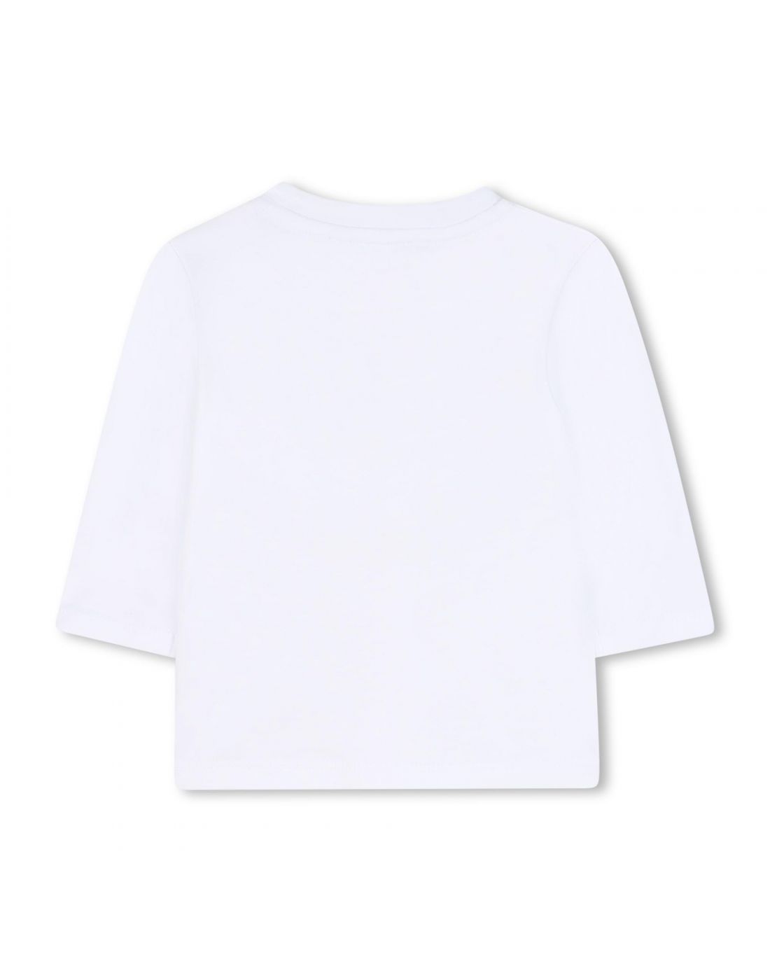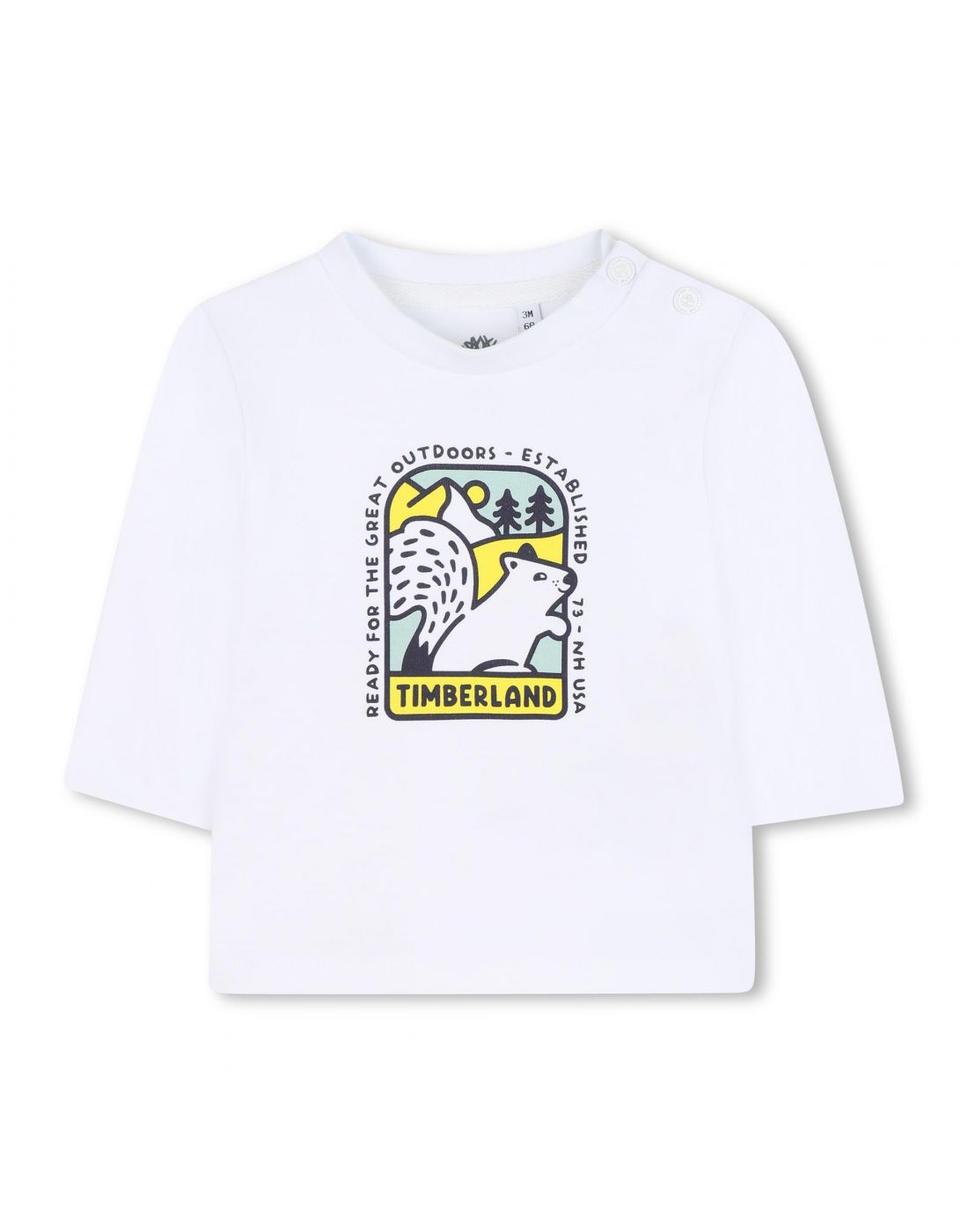 Μπλούζα από interlock 100% βαμβάκι βιολογικής καλλιέργειας με κούμπωμα τρουκ στον ώμο και τυπωμένη εικονογράφηση μπροστά.