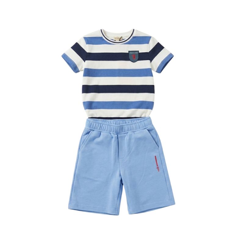 Το σετ μπλουζάκι και σορτς Trussardi Junior για αγόρια με εκτύπωση λογότυπου είναι κατασκευασμένο από 100% βαμβάκι, το μπλουζάκι διαθέτει ρίγες, κοντά μανίκια, στρογγυλή λαιμόκοψη και ίσιο τελείωμα. Το σορτς σε γαλάζιο χρώμα διαθέτει ελαστική μέση για εύκολη εφαρμογή.Κατάλληλο για καθημερινές εμφανίσεις.